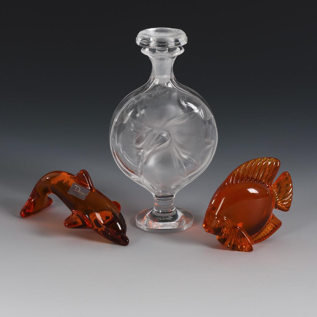 2x DAUM/Nancy: Delfin und Fisch aus orangefarbenem Glas (L 12,5 und 8,5 m). / 1x LALIQUE: runder Plattkorpus aus farblosem Glas, mit Enghals, Stopfen und Rundfuß; mit einer mattgeätzten Rosenblüte (H 17 cm).