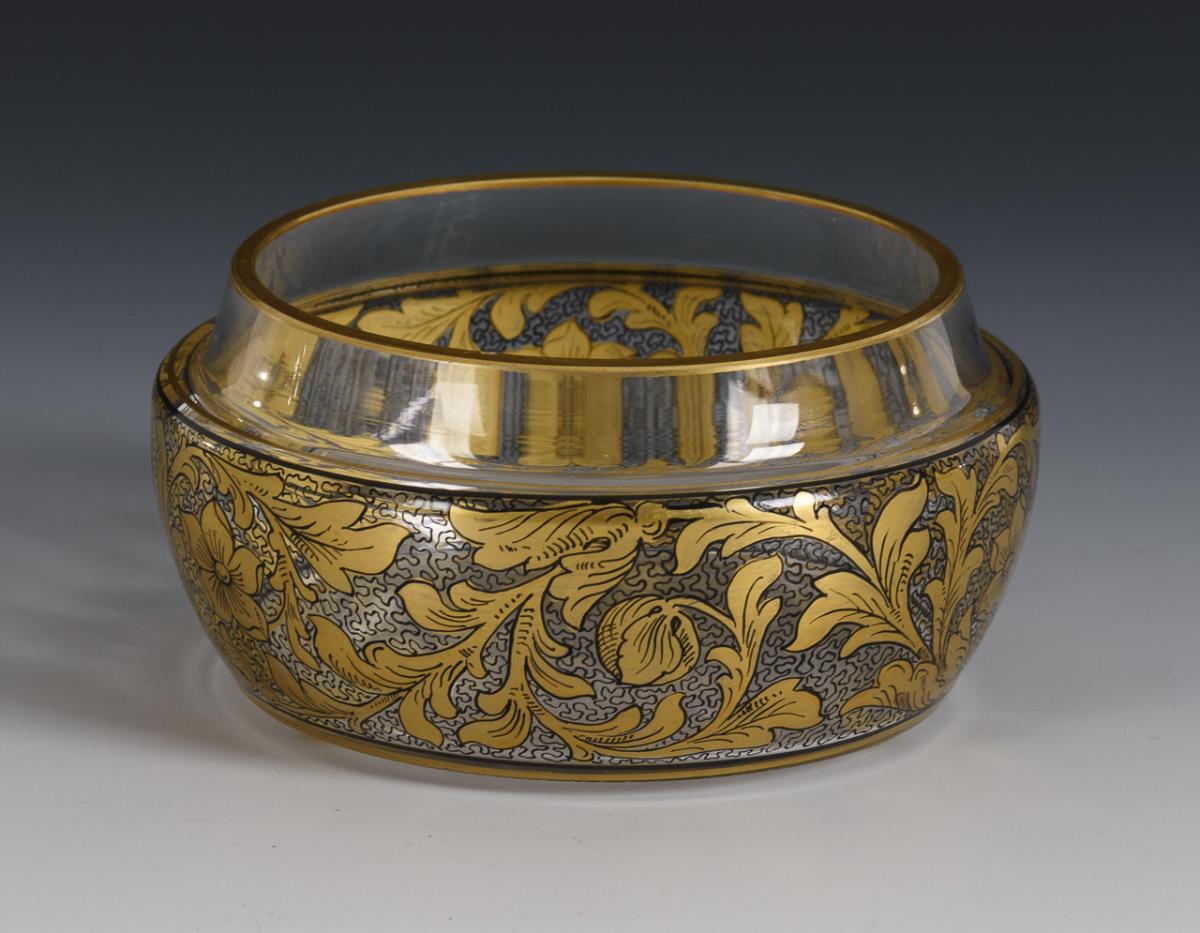 Leicht gebauchte Schale aus farblosem Glas mit eingezogenem Mündungsrand. Umlaufend schwarzlot- und goldgemalte Blätter und Blüten. Minimale Randbestoßung.