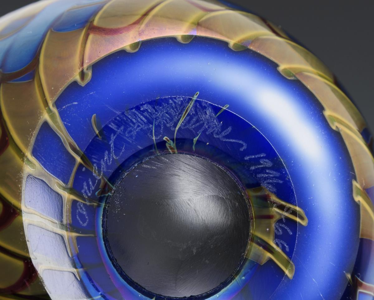 Balustervase aus kobaltblauem Glas mit Milchglasinnenfang sowie wellenartig gekämmter Fadenaufschmelzung in Ocker und Weinrot, irisiert.
