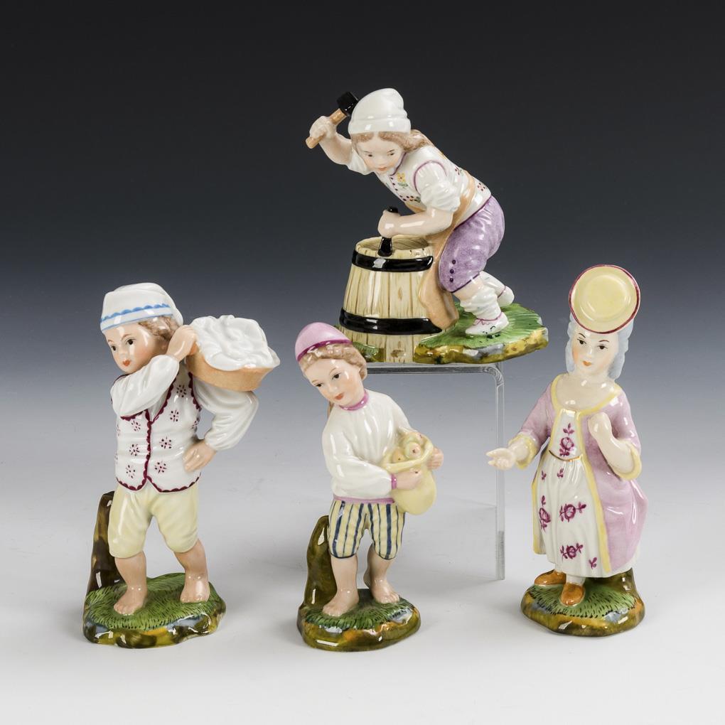 Knabe als Böttcher, Rokokomädchen, Knabe mit Wäschekorb und Knabe mit Birnensack.