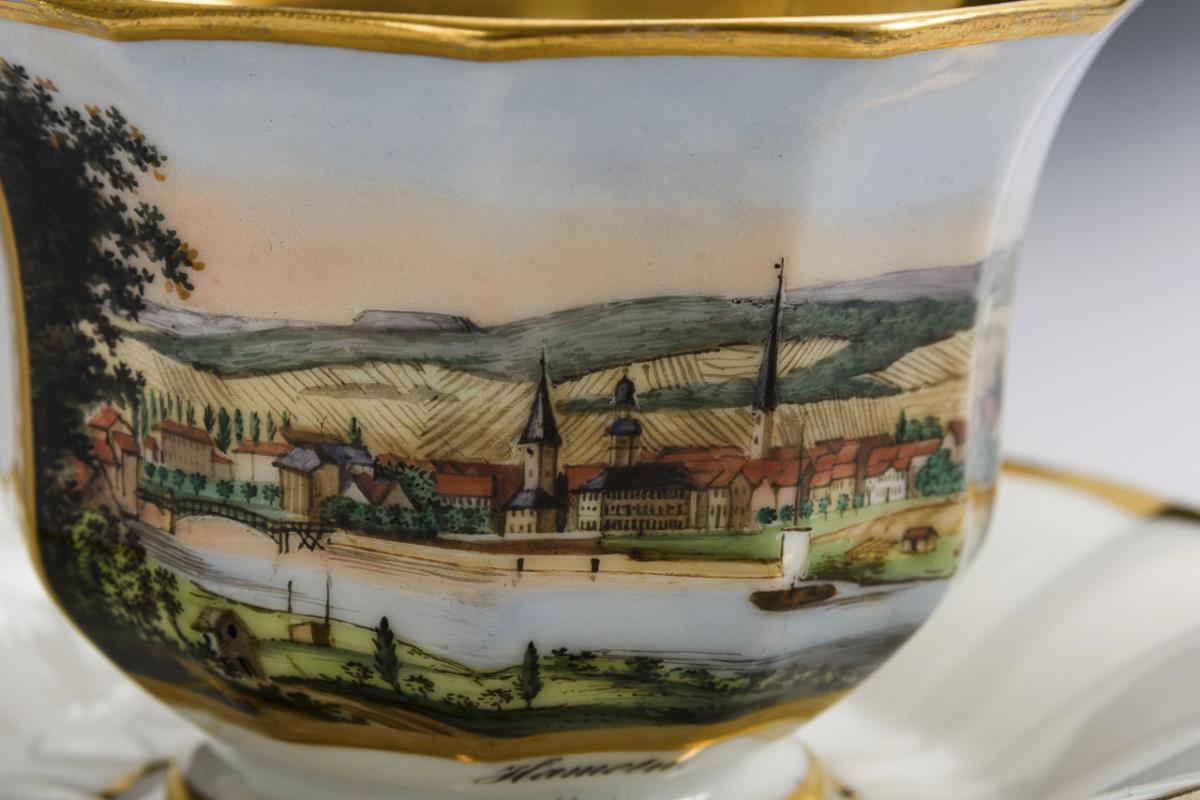 Gefußte, polygonale Glockentasse mit spitz geschweiftem Henkel. Schauseitig eine goldgerahmte Rechteckkartusche mit der bezeichneten Ansicht der niedersächsischen Stadt Hameln an der Weser. Minimaler Goldabrieb.