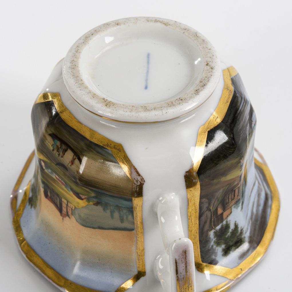 Gefußte, polygonale Glockentasse mit spitz geschweiftem Henkel. In drei goldgerahmten Reckteckkartuschen Ansichten von Landschaften mit See, Schloss bzw. Ruine und Figurenstaffage. Gold berieben, Bestoßung am Henkel.