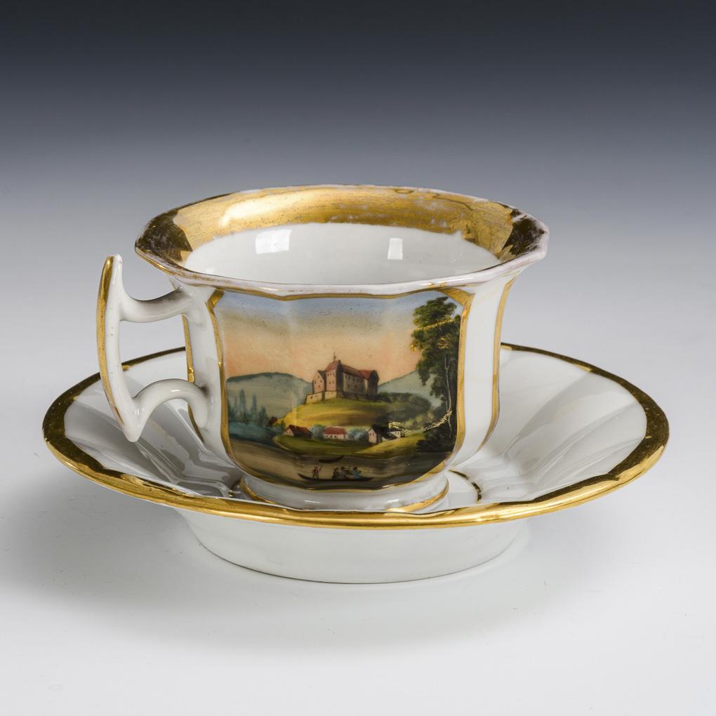 Polychrom bemalt, goldstaffiert. Tasse (H 6 cm), Untertasse (Ø 14 cm).