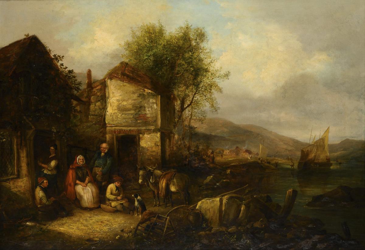 Bauernfamilie vor dem Haus nahe dem Ufer mit den Seglern im Sonnenschein. Leinwand doubliert.