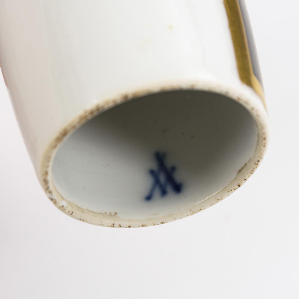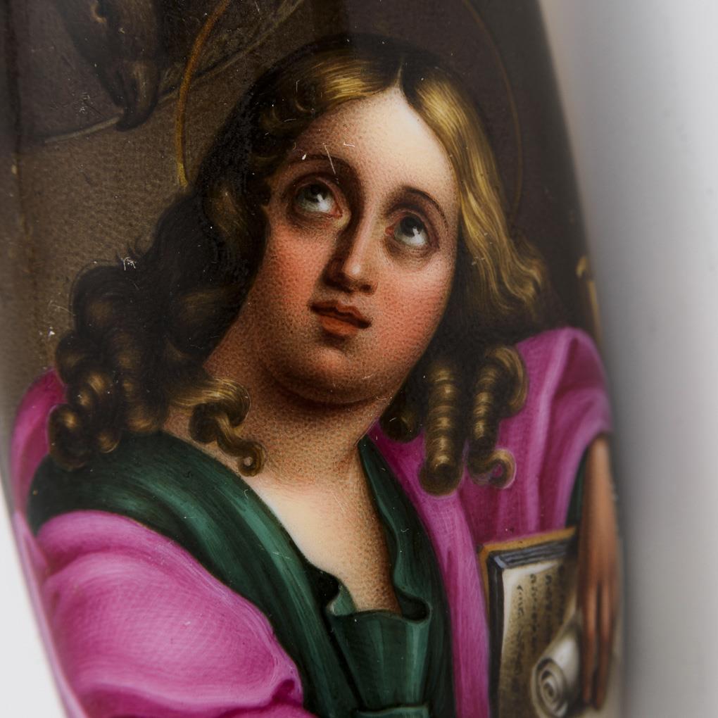 1x MEISSEN: in einer goldgerahmten Rechteckkartusche die Darstellung des Heiligen Johannes. / 1x ungemarkt: in einer goldgerahmten Rechteckkartusche die fein gemalte Darstellung eines bärtigen Mannes; mit metallmontiertem Deckel. Partieller Goldabrieb, Pfeifenkopf Meissen restauriert.