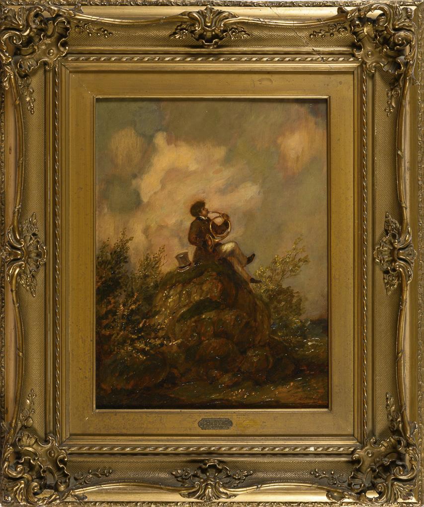 Junger Mann mit dem Horn auf einem bewachsenen Felsen im Sonnenschein.