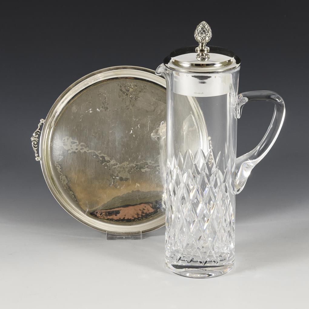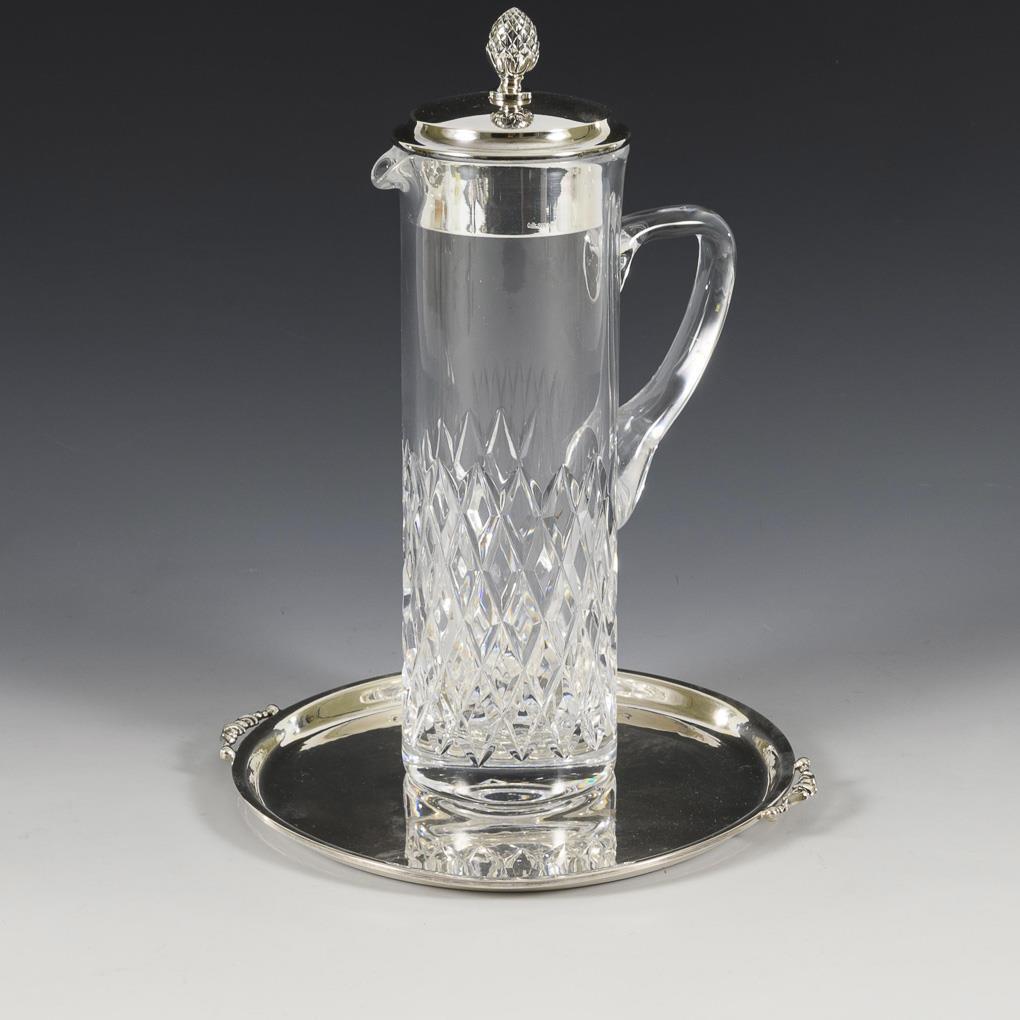 Schlanke Zylinderkanne aus Klarglas, silberner Steckdeckel mit Zapfenknauf (Wilhelm Binder). H 27,5 cm. / Handgearbeitetes, kleines Tablett mit 2 reliefierten Handhaben. Ø 20,5 cm. Tablett gedellt.