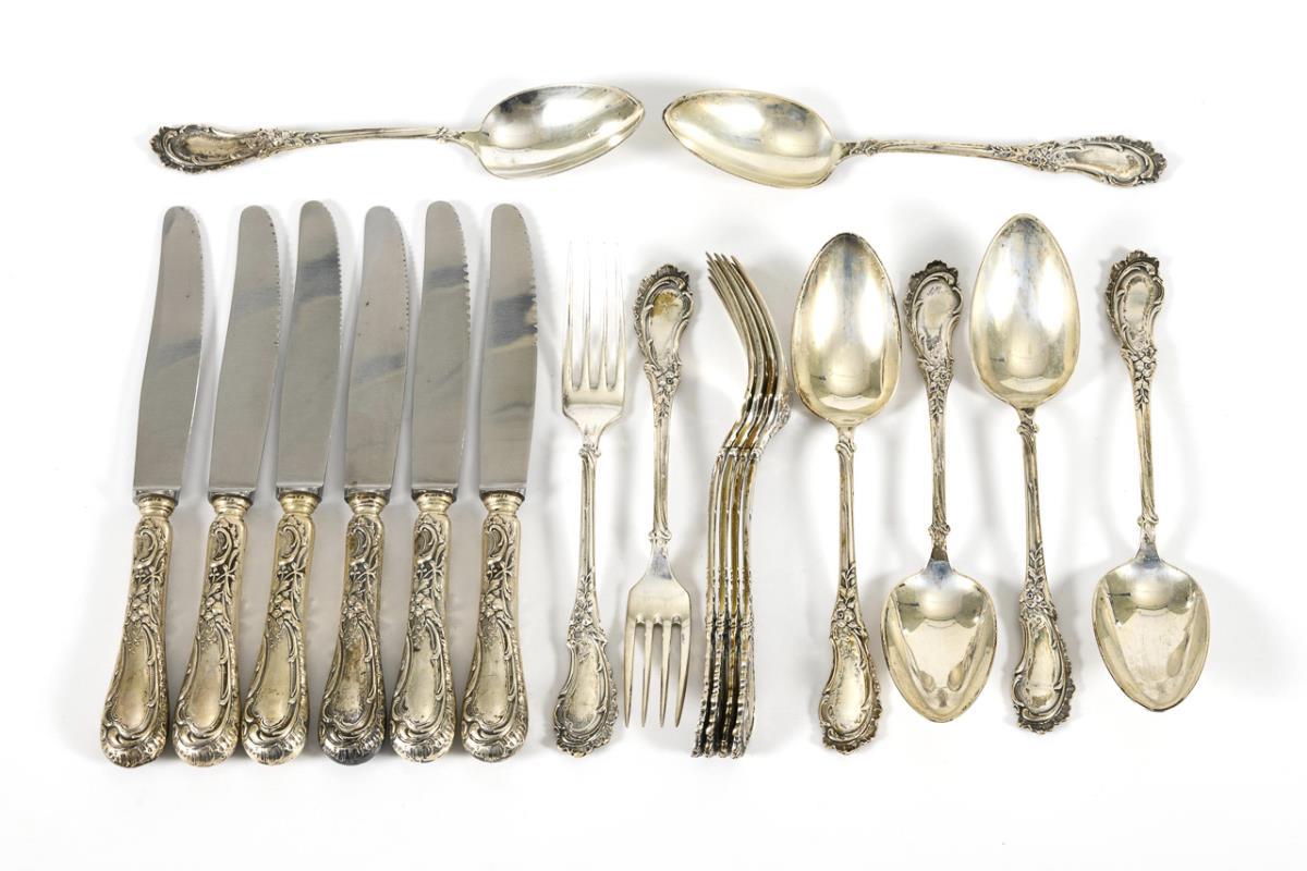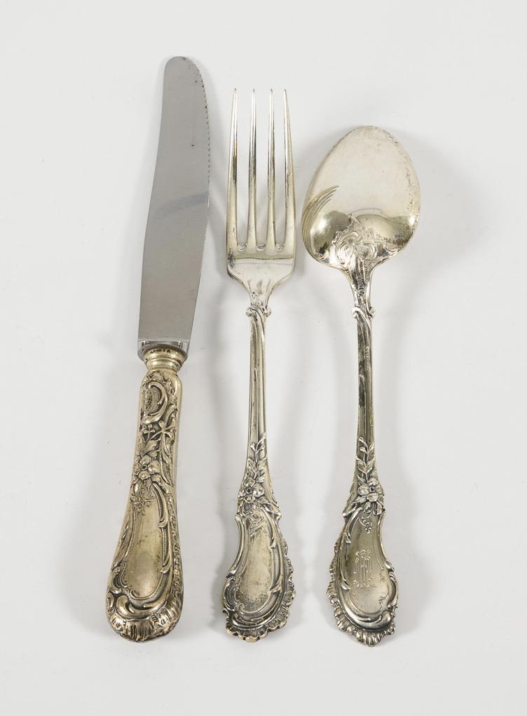 Mit Rocaillen und Blüten reliefiert: 6 Speisegabeln, 6 Speisemesser und 6 Suppenlöffel (davon 5 mit Monogrammgravur "PM").