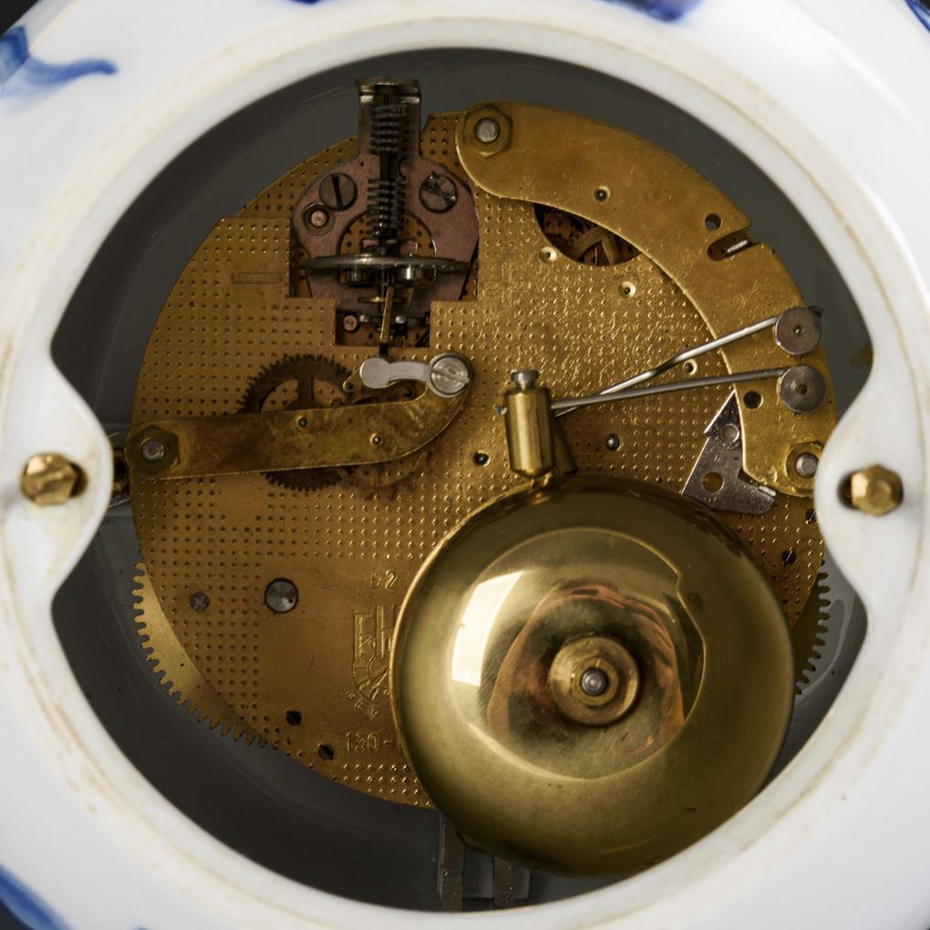 Schon seit den Anfängen der Meissener Manufaktur, beschäftigte man sich mit der Herstellung von Uhrengehäusen, wie die umfangreiche Sammlung der Schauhalle in Meißen belegt. Den letzten großen Wurf schafften Ludwig Zepner und Heinz Werner mit verschiedenen Uhren in der Formsprache "Großer Ausschnitt". Sie kommen relativ selten vor und werden in der Literatur wenig beschrieben (vgl. Klassisches Meissen, S. 96, Abb. S. 97 und 106, Meissener Porzellan von 1720 bis zur Gegenwart, S. 140). Die hier gezeigte Variante mit dem Dekor "Blaue Orchidee" von Heinz Werner spricht exemplarisch für die Experimentierfreudigkeit und Formensprache der späten 70iger Jahre. Auf einem organisch harmonischen Fuß thront eine formvollendete Kugel auf deren abgeflachter Seite ein Zifferblatt gestaltet ist, das sowohl moderne als auch barocke Elemente aufnimmt. Kühn, exzentrisch, gewagt ... - Peter Strang gelingt hier ein Statement: Meissener Design ist immer auf der Höhe der Zeit, mehr noch innovativ, forsch und zukunftsweisend.