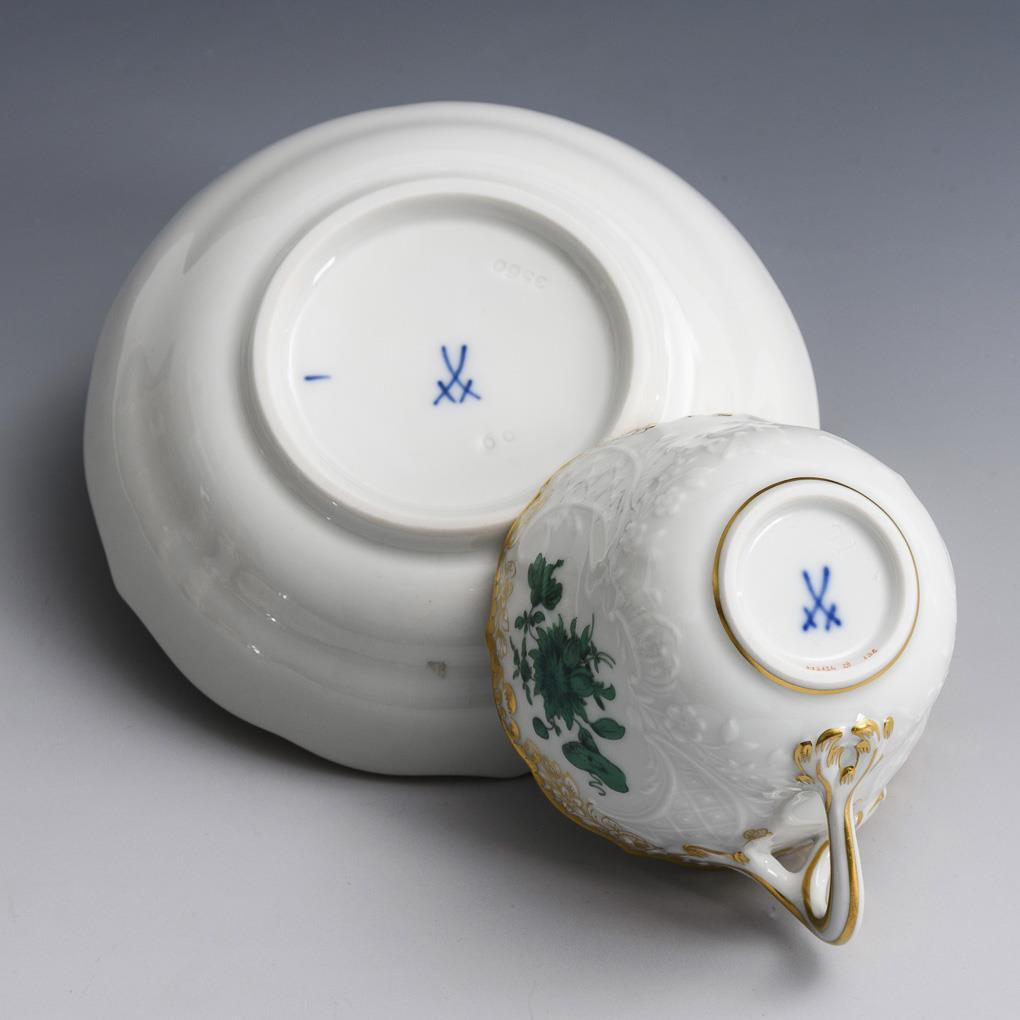 Kupfergrüne und polychrome Malerei, Goldstaffage. Tasse (H 5,5 cm), Untertasse (Ø 11,5 cm).