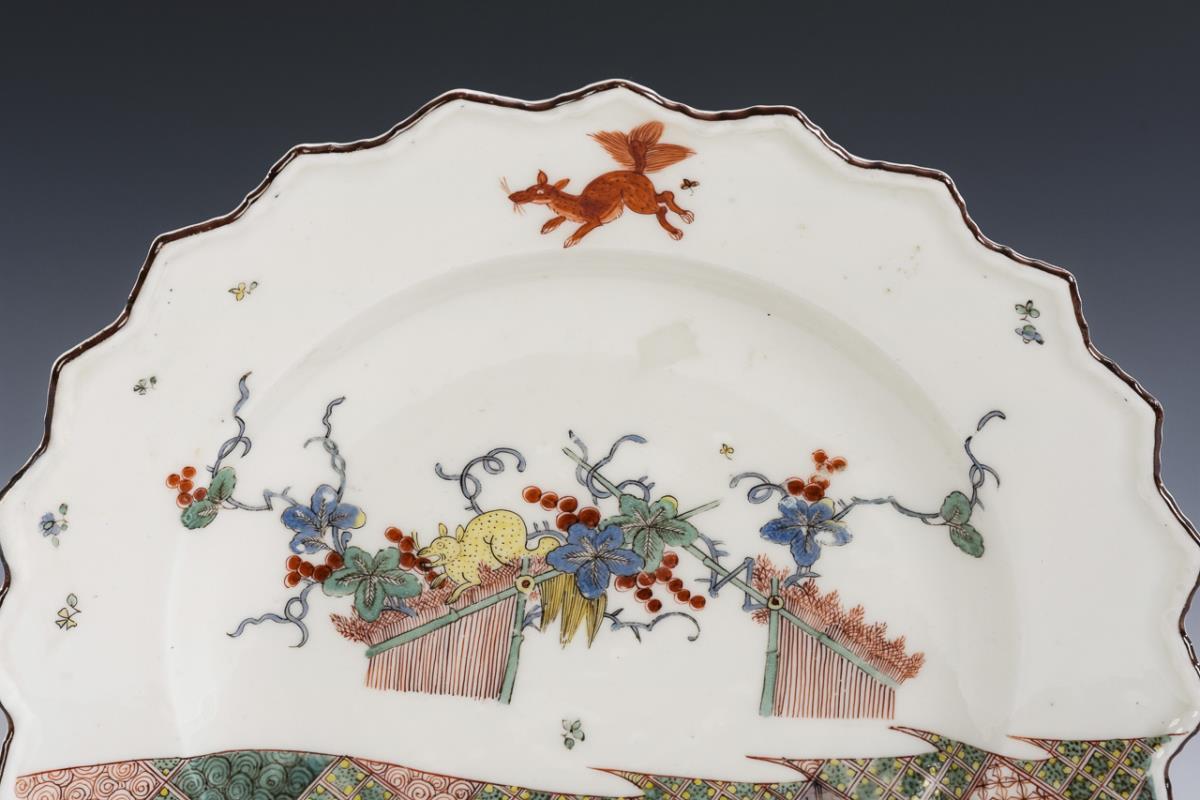 Dieser außergewöhnliche und fantasievoll durchgestaltete Teller lebt von zwei fast gegensätzlichen und dennoch zusammenhängenden Darstellungen : Der grafischen geometrischen Anordnung von fein gemalten Quadraten (Schachbrett) und einer Kakiemon-Malerei in der Weißfläche, auch bekannt unter der Bezeichnung "Eichhörnchen, Reben und Reisighecke". In der Fahne des Tellers findet sich ein weiteres anscheinend fliegendes Tier. Die Begrenzungslinie beider Flächen erinnert an den gezackten Rand eines Blattes. Über die dargestellten Tiere auf dem Teller gehen die Meinungen auseinander. Zu sehen sind zwei Nager. Sie gingen in die Porzellanliteratur auch als "Trauben naschende Eichhörnchen" ein. Eines (gelb) sitzt naschend auf einem Bambuszweig und könnte auch eine große Maus sein. Das andere schwebt auf der Fahne und erinnert an ein Flughörnchen, vielleicht auch an einen Fuchs. Ursprünglich findet sich dieses Motiv auf Nanking-Porzellan des 16. Jahrhunderts, wurde von japanischen Porzellanmalern aufgegriffen und weiterbearbeitet und gelangte schließlich auch nach Meissen, wo es in die Hoym-Lemaire-Affäre verwickelt war (s.o., Weber, Meißener Porzellane mit Dekoren nach ostasiatischen Vorbildern). In Meissen wurde es ab ca. 1730 auf Schüsseln, Blattschüsseln und Zackentellern verewigt. Ein Teller dieser Art befindet sich u.a. in der Sammlung Ernst Schneider (Schloss Lustheim, München). Im Bestandskatalog zu den Porzellanen mit Dekoren nach ostasiatischen Vorbildern in Schloss Lustheim hat Frau Julia Weber den Dekor und auch Formen sehr gut aufgearbeitet. Eine Schüssel dieser Art verwahrt auch das Victoria and Albert Museum, London | Nachtrag 21.10.23: kleine Farbrestaurierung im Spiegel.