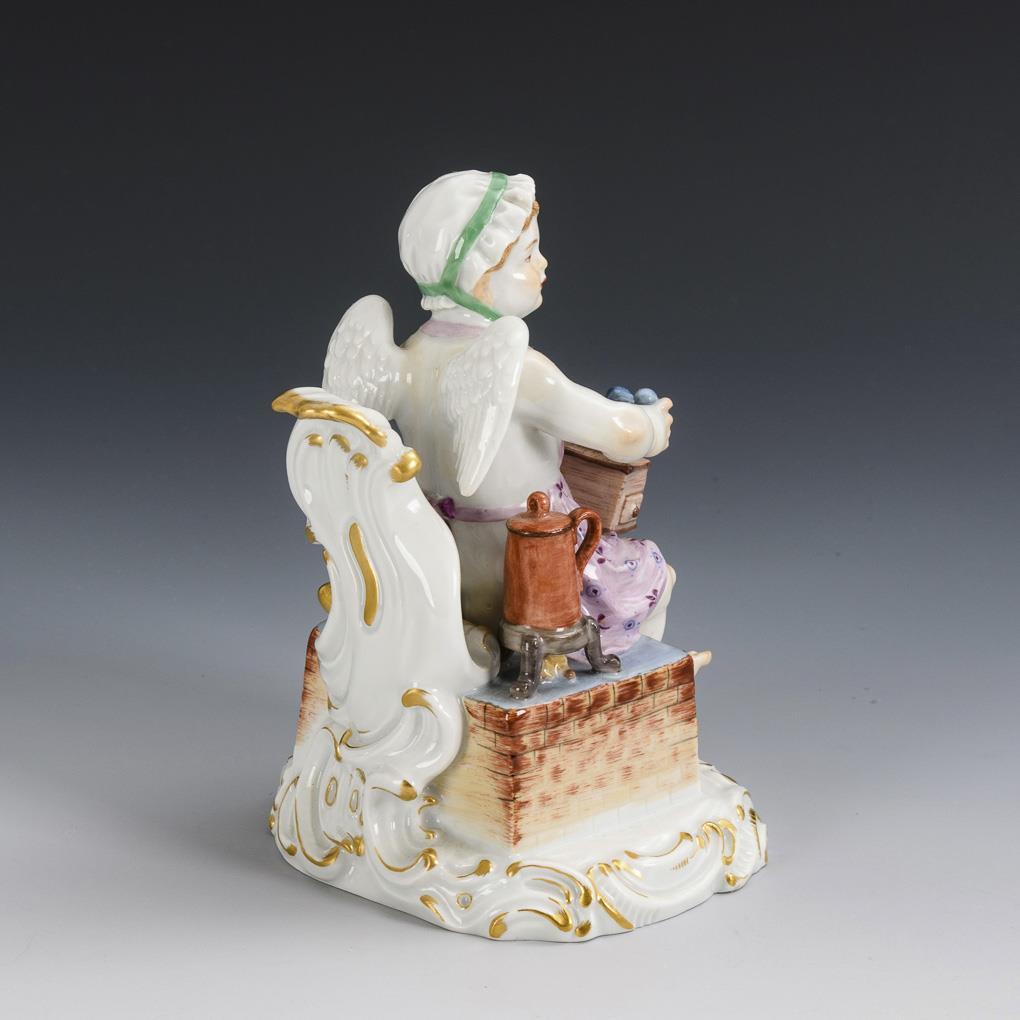 Auf einem Herd sitzender Amor mit Kaffeemühle.