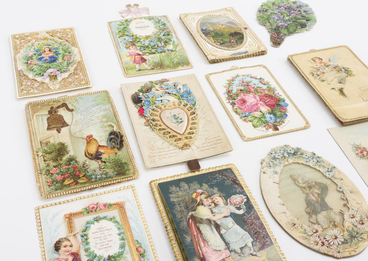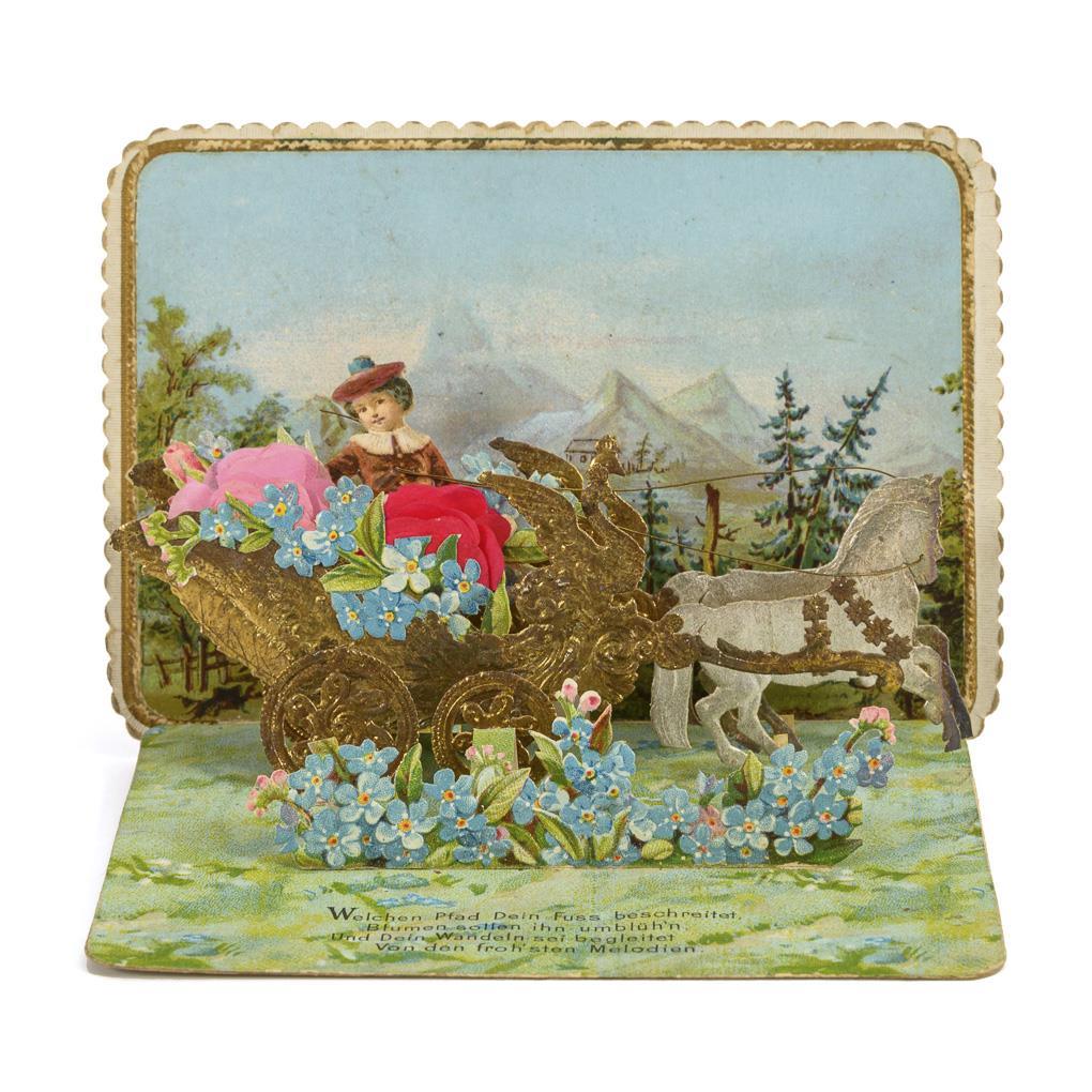 Zugkarten und Klappkarten, teils in mehreren Ebenen sich entfaltend, darunter 1 doppelt aufklappbares Kuvert rückseitig mit Zugbild. 1 benutzbarer Fächer. Wenige Alters-/Gebrauchsspuren.