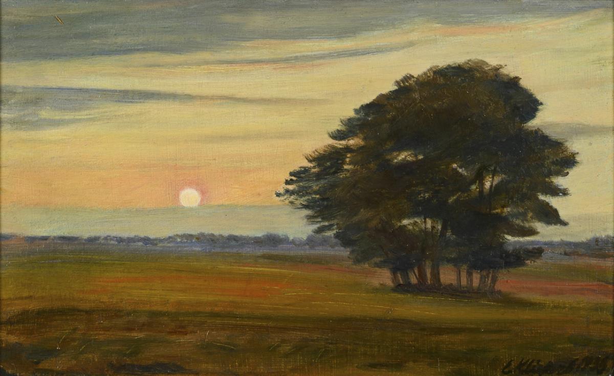 Baumgruppe auf weitem Feld bei tief stehender Sonne. Leichte Altersspuren.