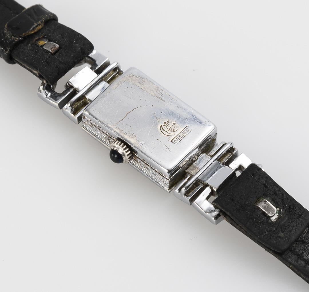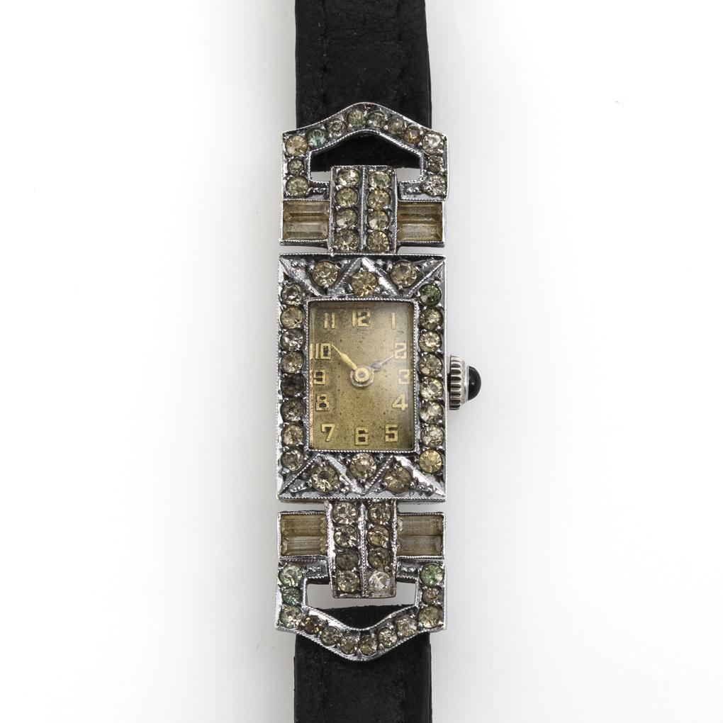 Rechteckiges Gehäuse mit breiter, steinbesetzter Lünette und Bandhalterung. Leichte Alters- und Gebrauchsspuren, 4 fehlende Steinchen (lose anbei in Etui).