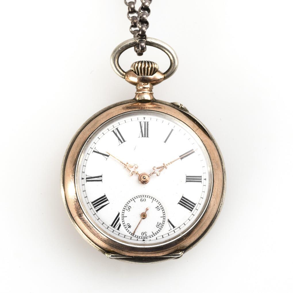 Galonné-Gehäuse mit guillochiertem Rückdeckel und leerer Wappenreserve. An silberner Gliederkette mit kleinem Federring. Minimale Alters- und Gebrauchsspuren.