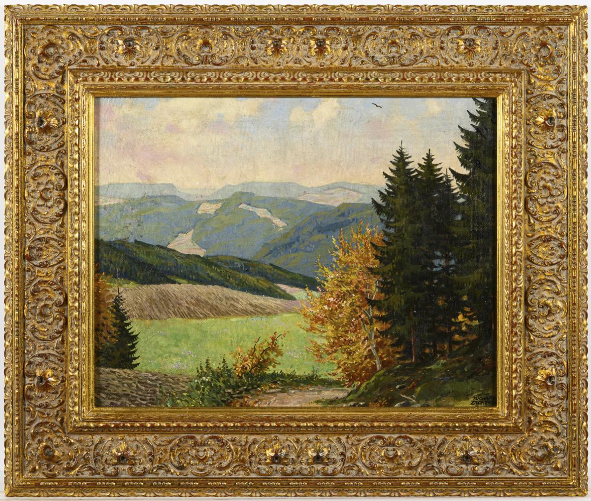 Bergige Landschaft mit Feldern und Wäldern im Herbst. Leichte Altersspuren.