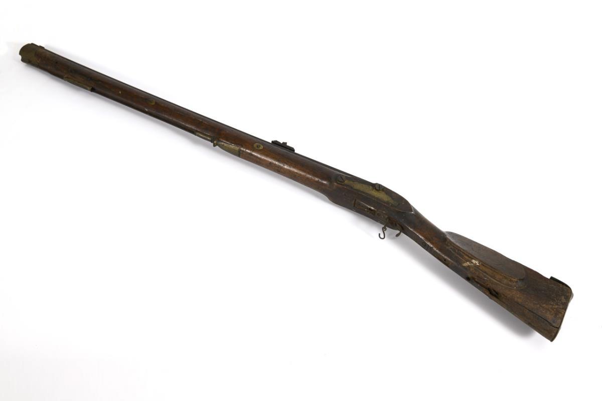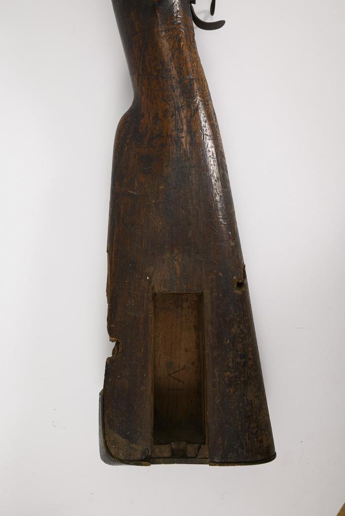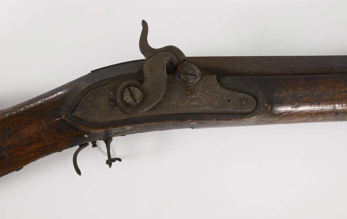 Perkussionsgewehr mit gezogenem Lauf, Kaliber 18 mm. Gegenschloßplatte punziert '19', Abzug und Stecher. Mechanik schwergängig. Es fehlt: Platte vom Kolbenfach, Abzugsbügel, Ladestock. Holzschaft mit Beschädigungen.