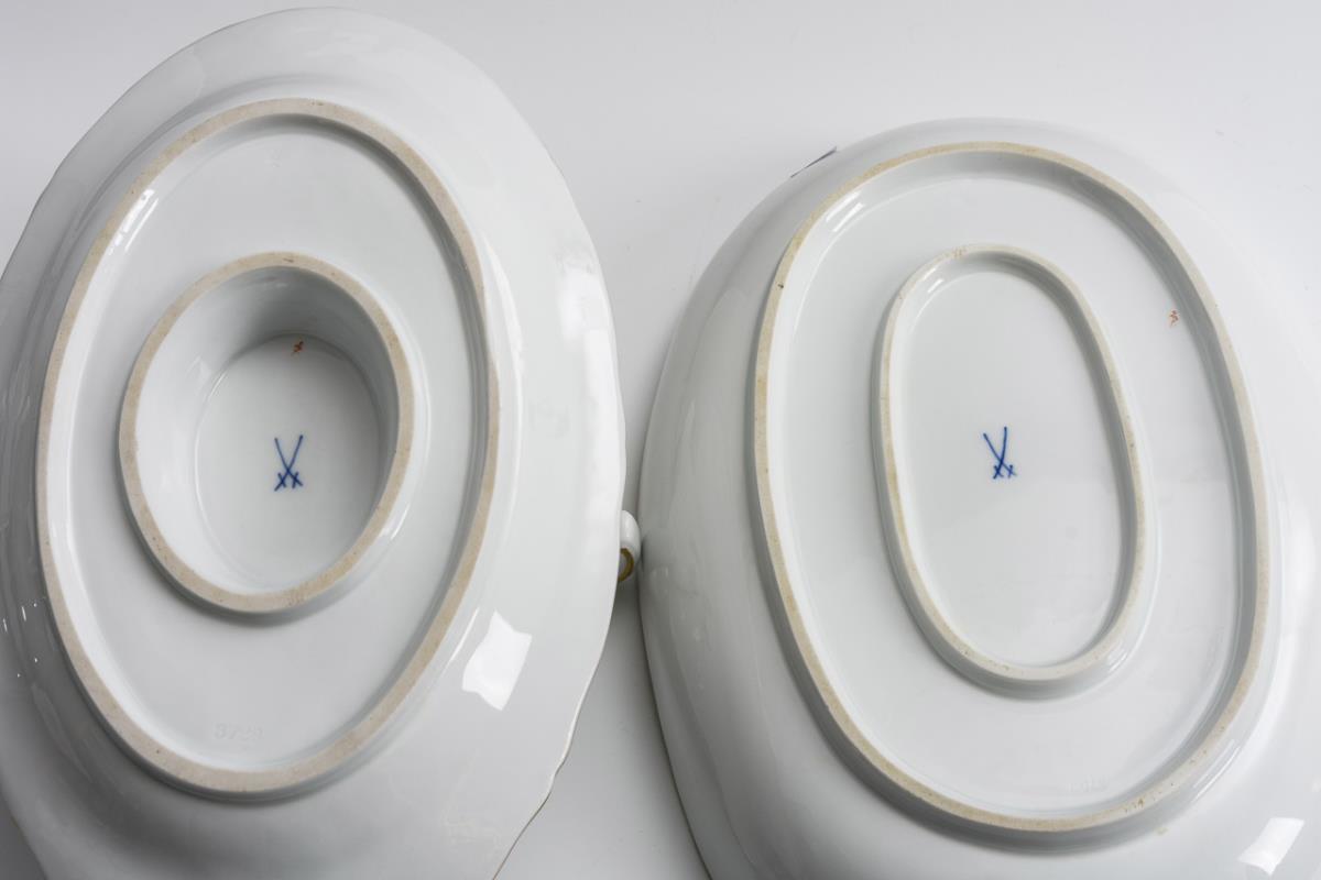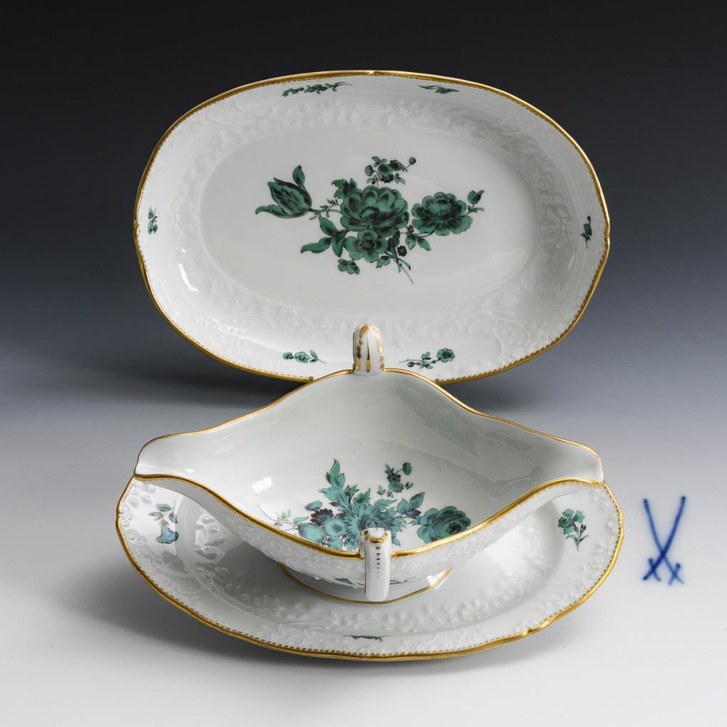 Sauciere und Ovalschale mit kupfergrüner Blumenmalerei. Meissen.