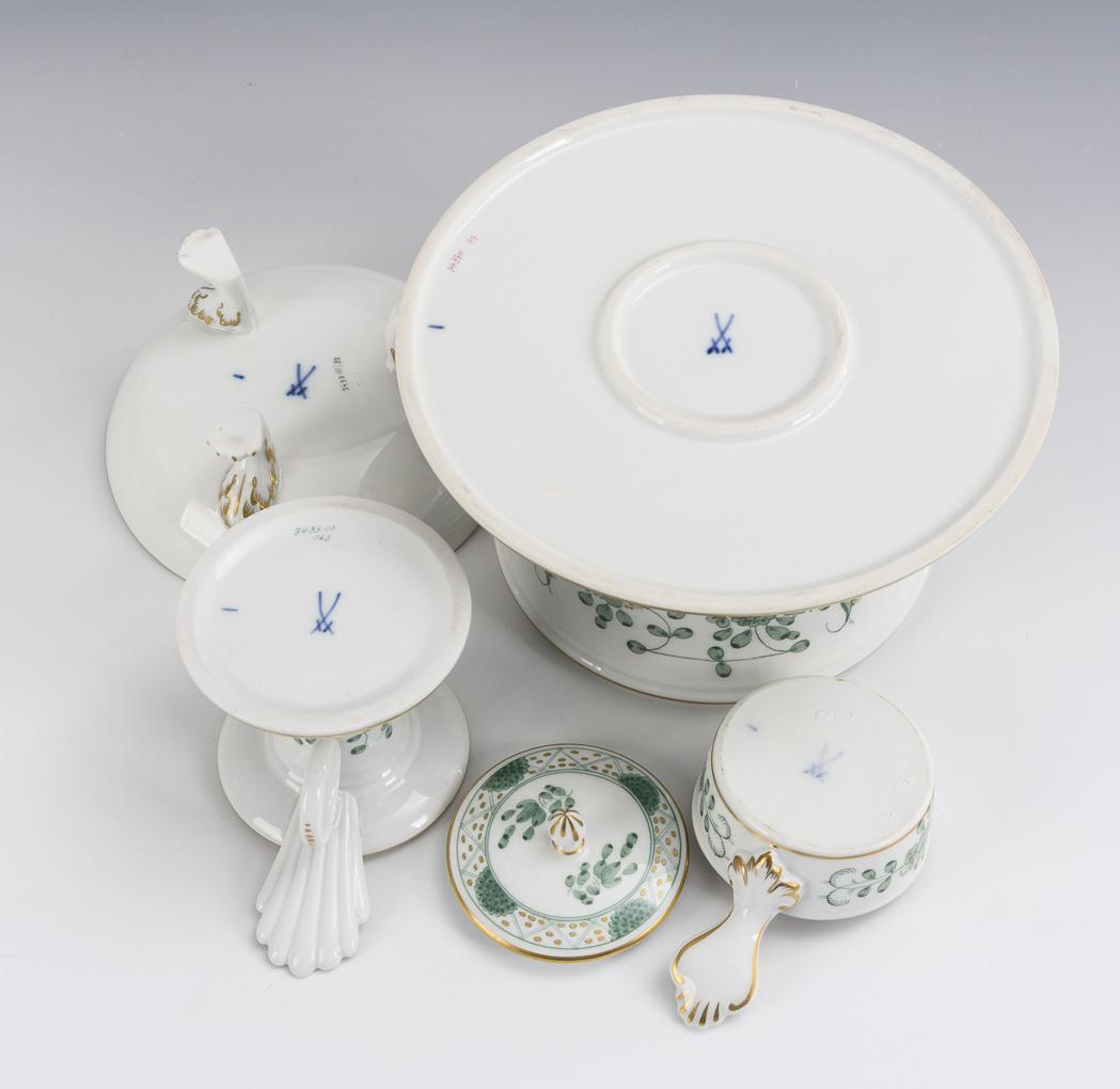 Stövchen, Kerzenleuchter und Schale "Indisch Grün". Meissen.