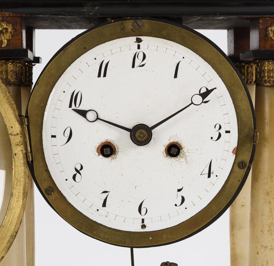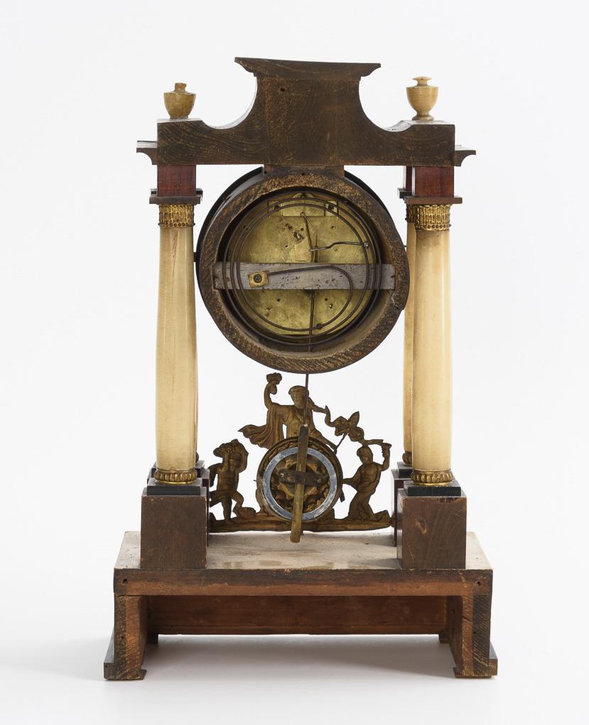 Klassizistisches Gehäuse mit 4 Alabastersäulen, gekehltem Giebel und gestuftem Sockel, verzierende Messingapplikationen mit antikisierender Darstellung der Ceres und zweier Bacchanten. Alters- und Gebrauchsspuren, mit Defekten.