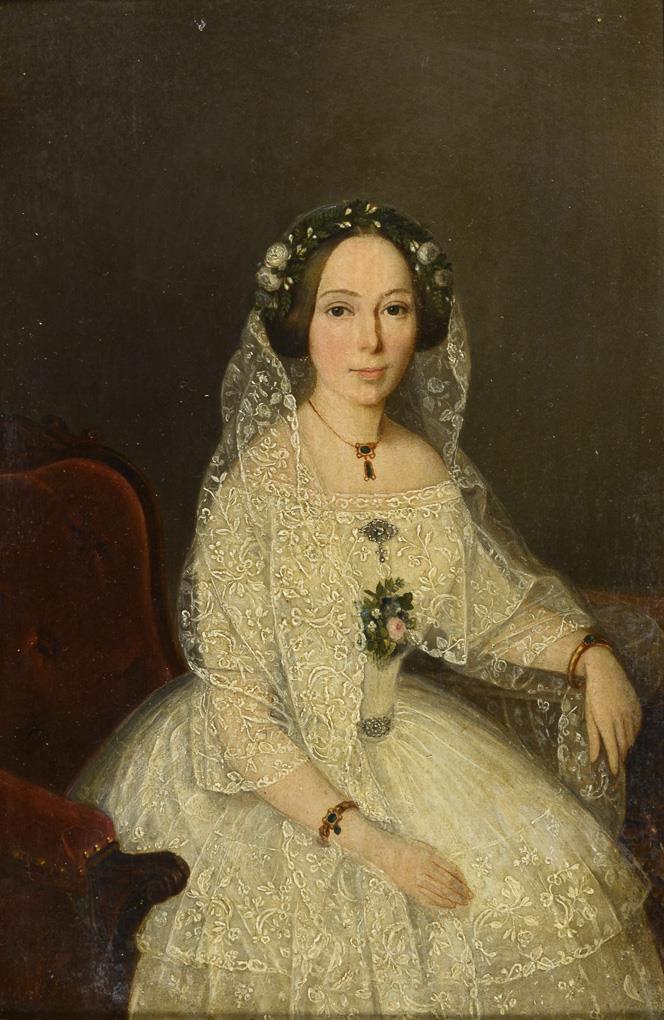Bildnis der Frau "Roth" als Dame im dunklen Kleid mit blauer Schleife im Haar sowie Porträt der Frau "Roth" als Braut im weißen Kleid mit Schleier und Blumenkranz.