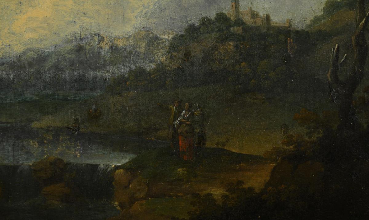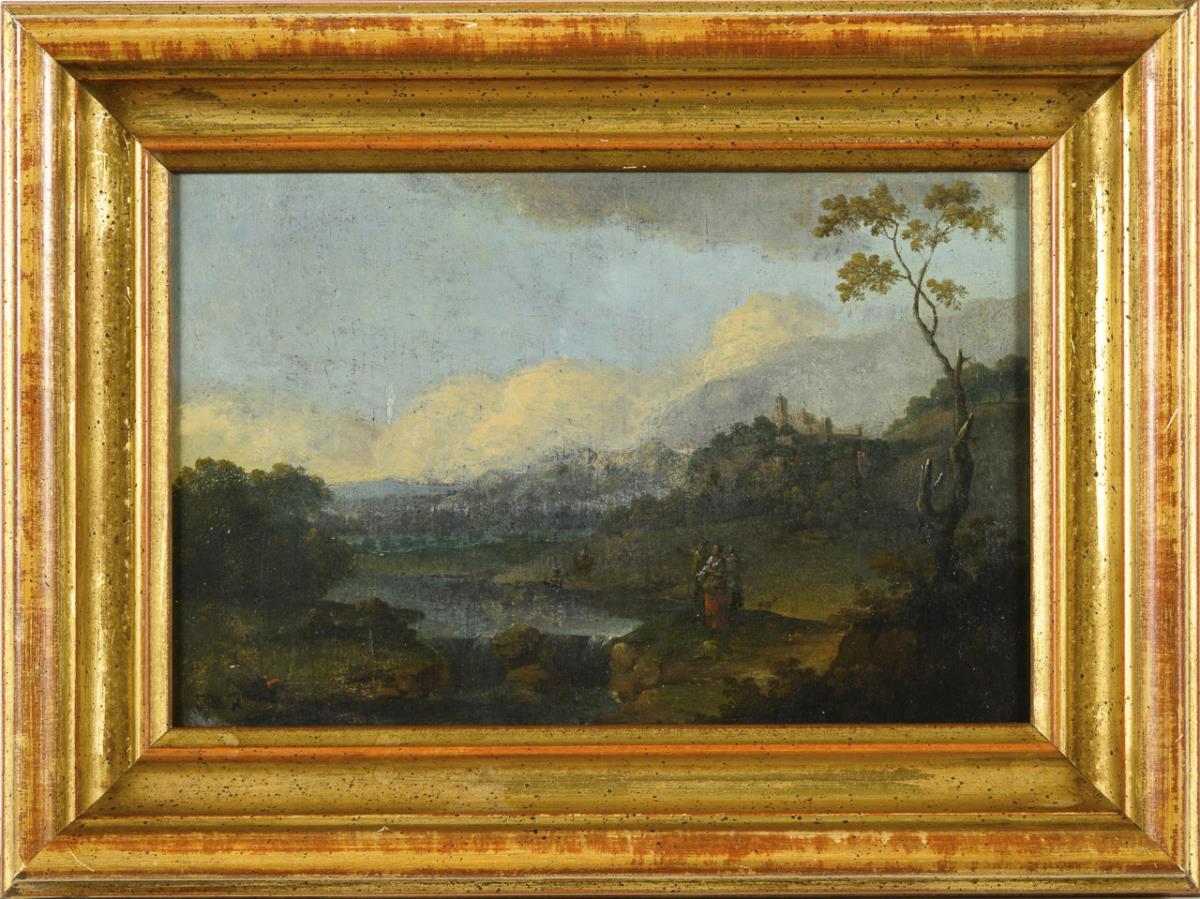 Staffagefiguren in der bergigen Gegend am Fluss mit der Burg am Horizont unter bewölktem Himmel. Altersspuren, Retuschen im Himmel.
