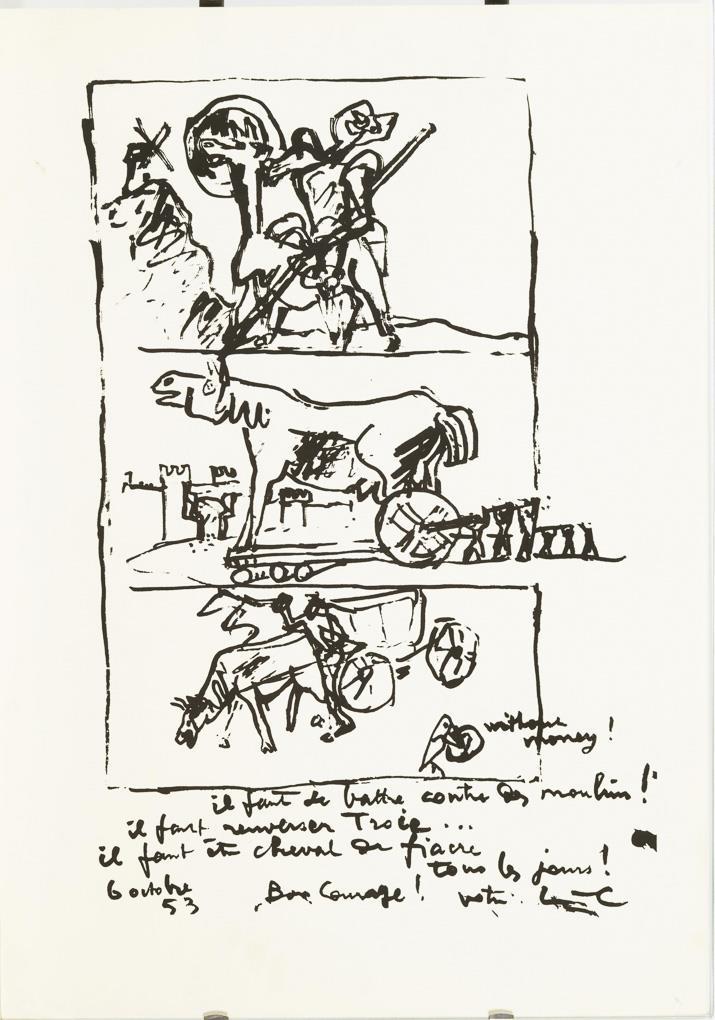 In französischer Sprache beschriftet "Il faut le battre contre des moulins! Il faut renverser Troie...il fait être cheval ou fiacre tous les jours! 6 octobre 53, Bon Courage! Votre L-C".