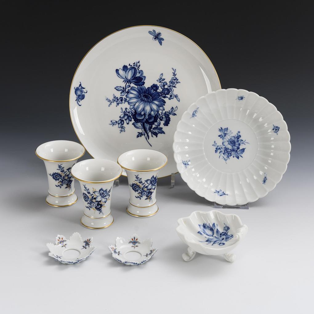 Kuchenteller (Ø 28 cm), 3 Kratervasen (H 9,5 cm), 1 Muschelschale (Ø 11 cm) und 1 Fächerplatte (Ø 20 cm) mit Blumen- und Insektenmalerei. / 2 Tropfteller "Royal bunt" (Ø 7,5 cm)