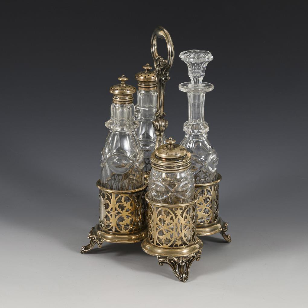 Versilberte Menage mit 4 durchbrochen gearbeiteten Halterungen und zentraler Ringhandhabe. Dazu 4 passende, wohl ergänzte Klarglasflaschen, davon 3 mit Silberdeckelchen (H 12 - 20 cm).