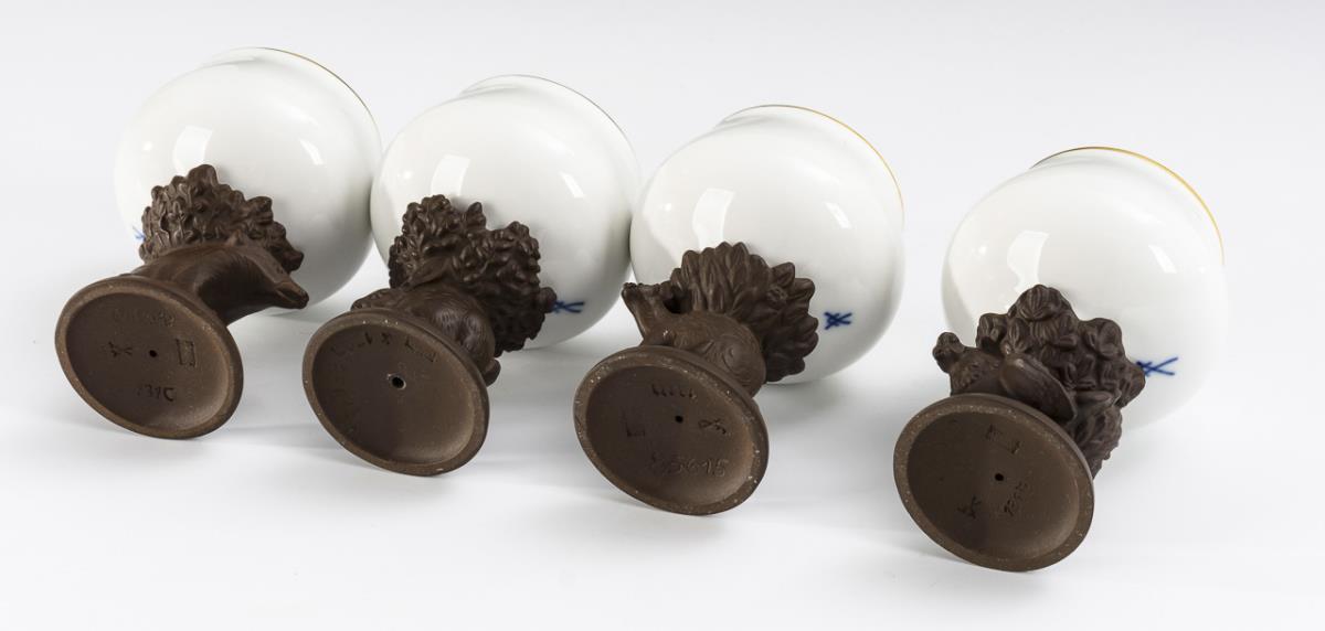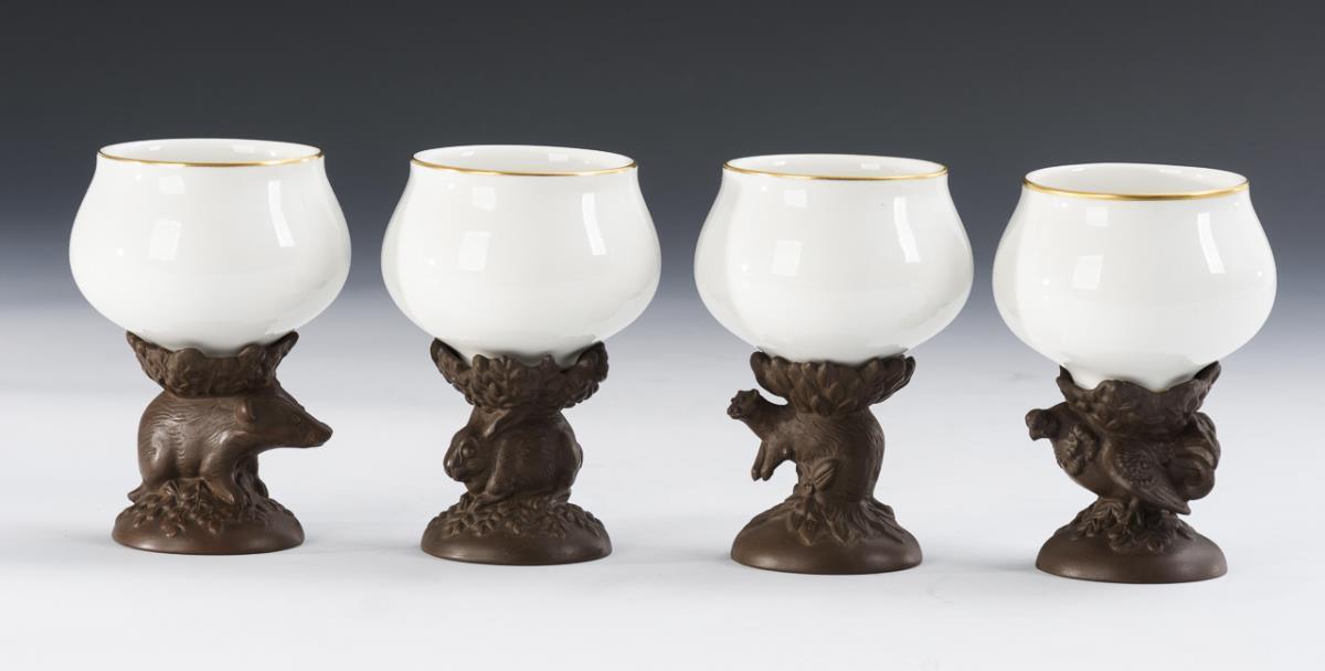 Bauchiger Kelch auf einem plastisch gearbeiteten Fuß mit Wildtieren (Wildschwein, Wiesel, Hase, Auerhahn). Minimale Bestoßung an 1 Fußrand.