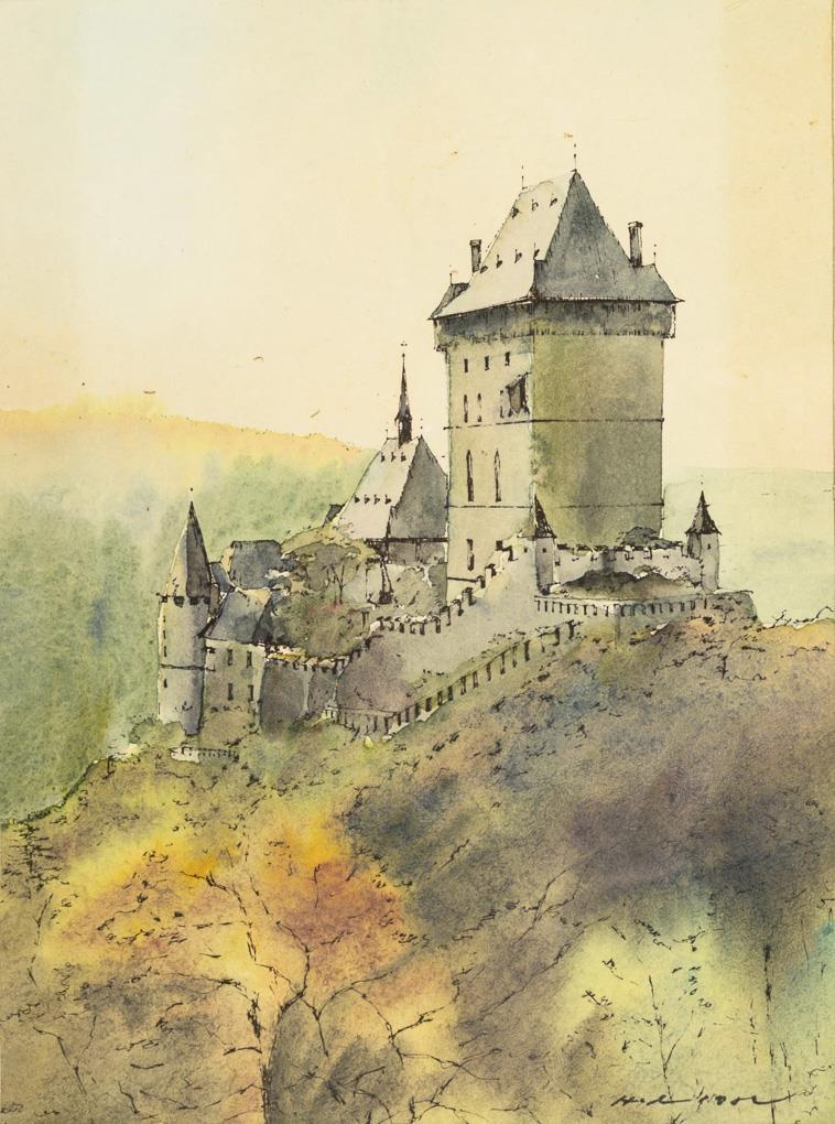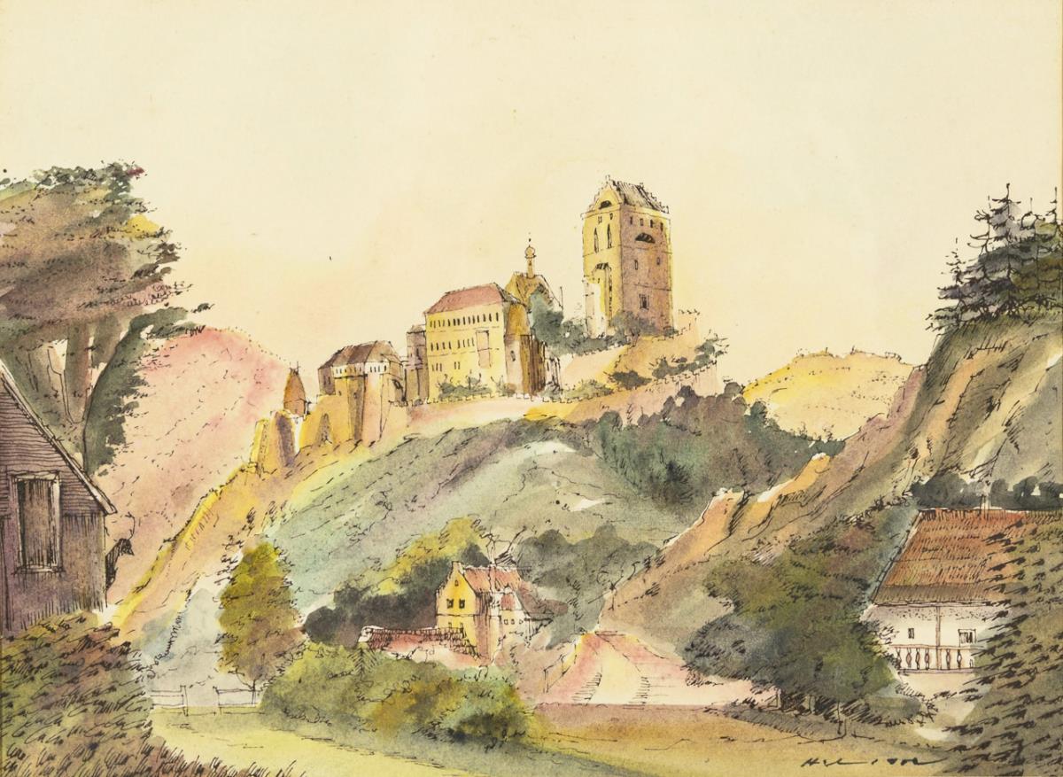 Jeweils Darstellung einer Burganlange auf einem Berg unter hellem Himmel. Je minimale Altersspuren.