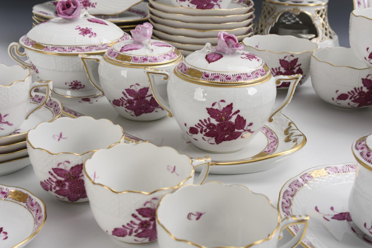 Form "Altozier". Kaffeekanne (H 25,5 cm), Mokkakanne (H 19,5 cm), 2 verschiedene Milchkännchen, 2 verschiedenen Zuckerdosen, 8 Tassen mit 8 Untertassen, 4 Mokkatassen mit 4 Untertassen, 8 Frühstücksteller, 1 Königskuchenplatte (L 36,5 cm), 1 Stövchen mit Brenner, 1 Cremetöpfchen mit Deckel, 1 Ovalschale (L 20 cm), 1 Nussschälchen und 1 Suppentasse mit Deckel und Untertasse . Kleine Bestoßung am Rosenknauf des Suppentassendeckels und Mokkakannendeckels.