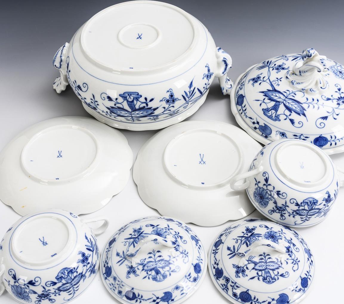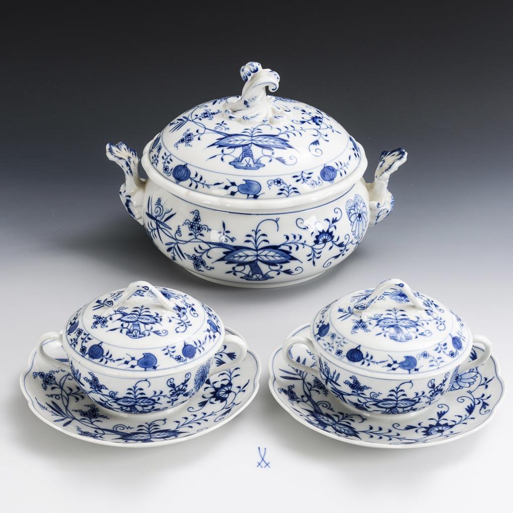 Zwiebelmuster-Terrine und 2 -Suppentassen mit Untertassen. Meissen.