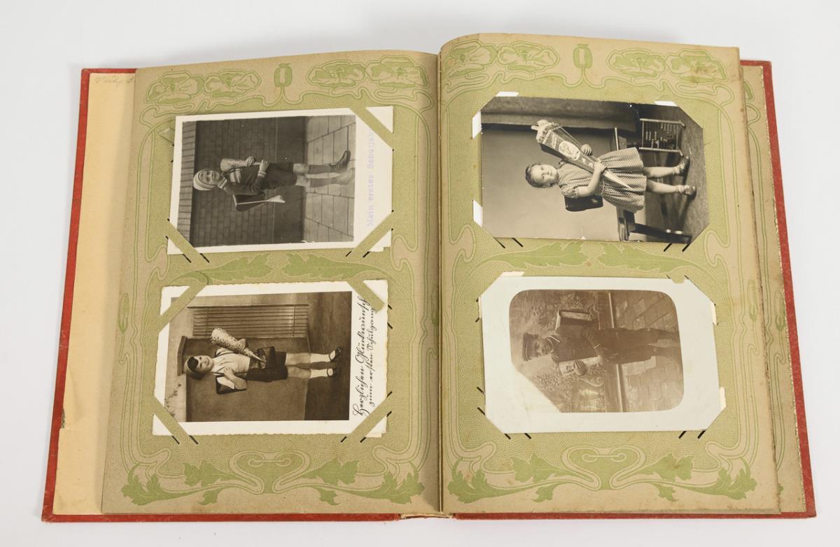 Motive: Kinder mit Schultüte bzw. Zuckertüte oder am ersten Schultag. Im roten "Album" mit Kresseblüten.