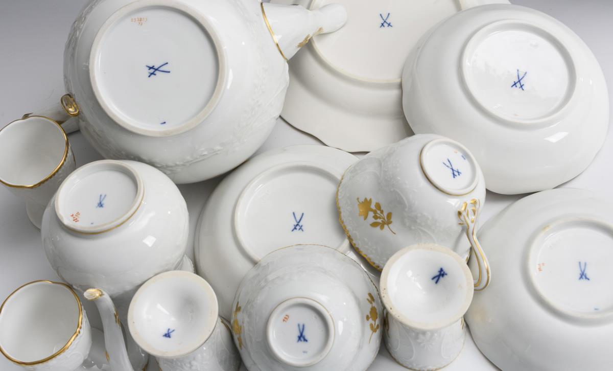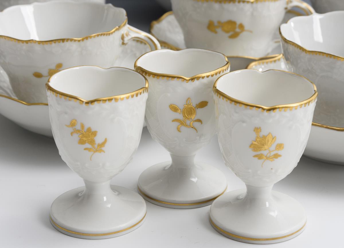 66 Teile. Form "Marseille". Kaffeekanne (H 23,5 cm), Teekanne (H 12,5 cm), Milchkännchen, Zuckerdose, 8 Tassen mit 10 Untertassen, 9 Frühstücksteller, 7 Eierbecher, 1 Tablett (L 27,5 cm), 9 Speiseteller, 6 Suppentassen mit 6 Untertassen, 1 Ovalplatte (L 36,5 cm), 1 Ovalschale (L 28,5 cm), 1 Gemüseteller (Ø 30 cm), 2 Quadratschüsseln (18,5 x 18,5 cm und 22 x 23 cm) und 1 Sauciere (L 26,5 cm), Als Zugabe 1 Kannendeckel. 2 Haarrisse am Mündungsrand der Kaffeekanne, Glasurhaarrisse im Spiegel des Gemüsetellers, minimaler Chip am Zuckerdosenrand und 1 Tassenrand, minimaler Goldabrieb an den Tassenrändern.