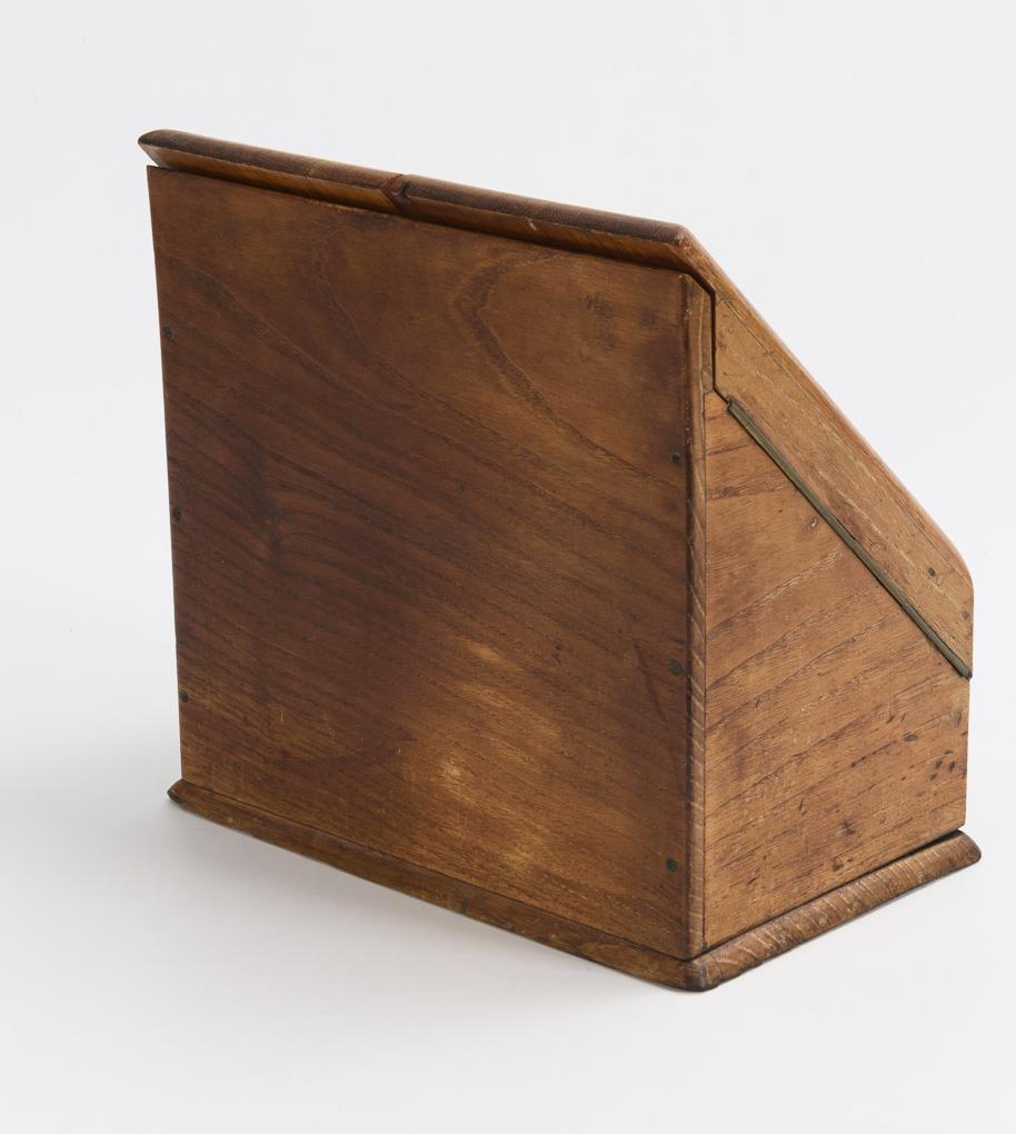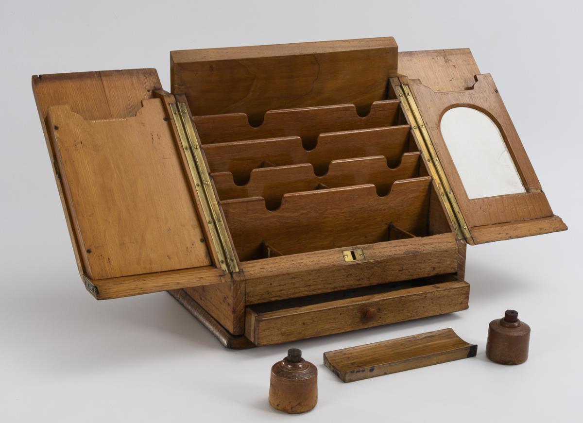 Pultförmiges Schreibbüro mit 2 Türen und Schublade. Innen Stiftablage, 2 Keramik-Tintenfässer und etliche Fächer auch in den Türen sowie 1 Notizfeld wohl aus Keramik. Beiliegend 1 Brieföffner aus Schmiedeeisen. Einige Alters-/Gebrauchsspuren.