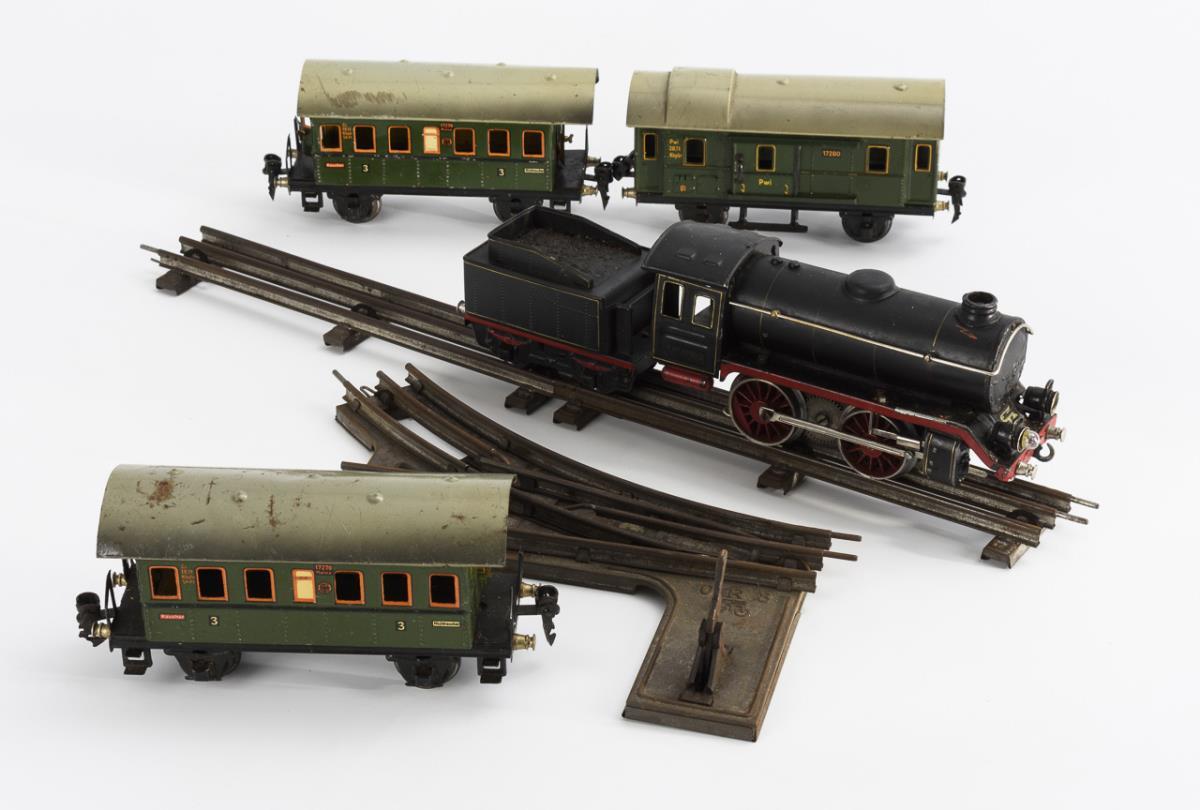 Schwarze Lok für Elektrobetrieb (L 19 cm) mit Tender, 2 Personenwagen 3. Klasse, 1 Güterwaggon "17280" mit 2 seitlichen Schiebetüren (L je 19,5 cm). Dazu Trafo "Der feinstufige Electric-Transformator mit Kurzschlussauslösung" (6-22 Volt), Tunnel, Signal, Lampe, ca. 20 Schienenstränge und 1 Weiche "0 R 8". Funktion nicht geprüft. Altersspuren, kleine Defekte, Lok: 1 Rad lose, 1 Glühlampe fehlt.