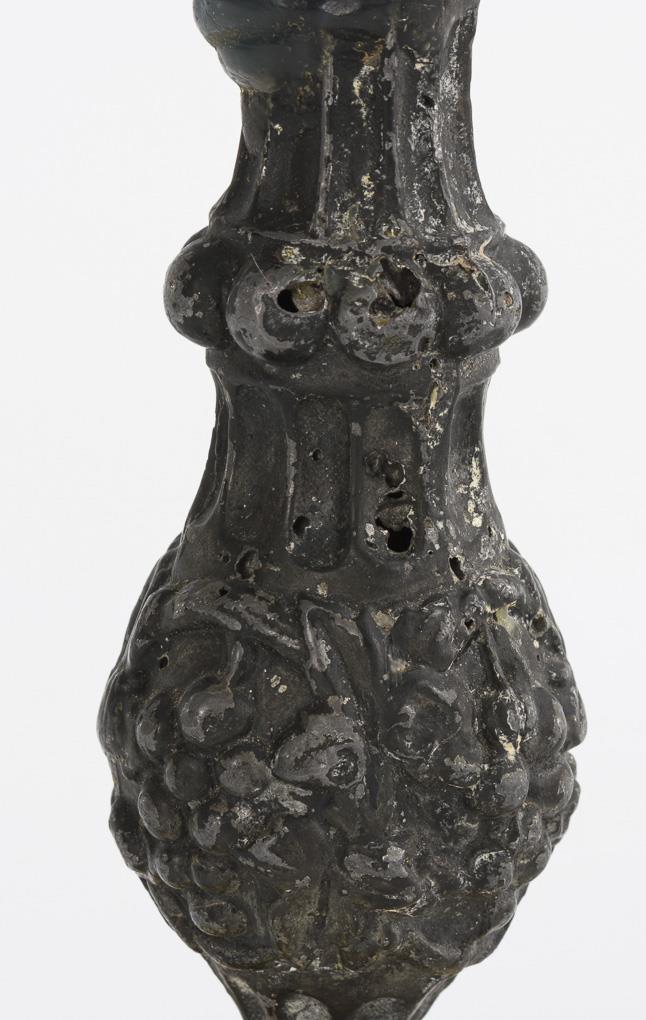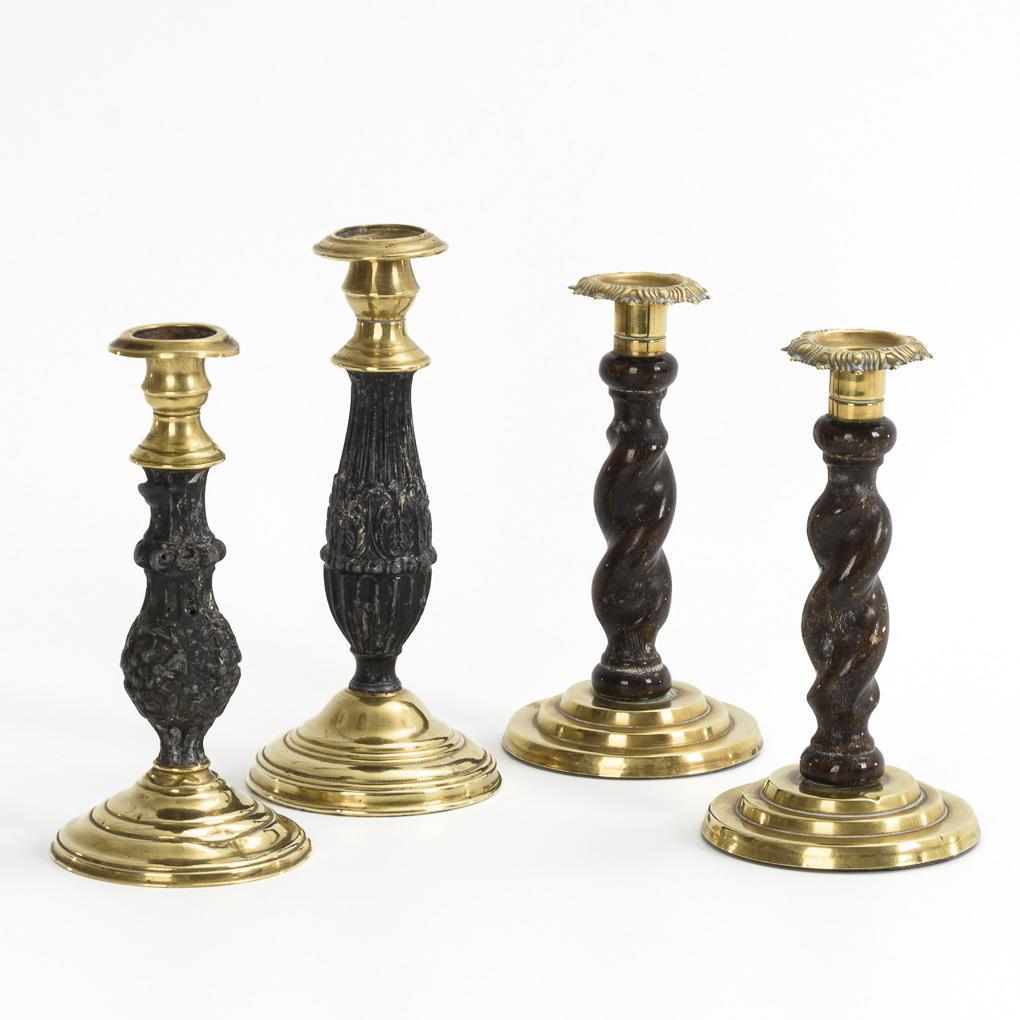 Leuchterpaar je mit einer Eisenplatte beschwertem, getreppten Fuß sowie tordiertem Holzschaft. / Ähnliche Leuchter je mit Sand gefüllte Füße und Metallschaft mit Reliefzier. Gebrauchsspuren, Metallschäfte mit kleinen Löchern.