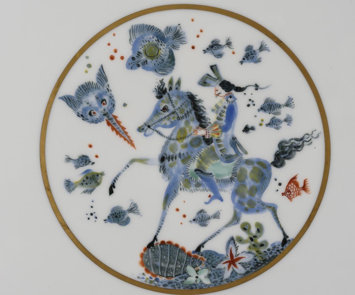 Form "Kollektivservice". Großer Teller mit zitronengelbem Teilfond, im Spiegel die Darstellung des Baron von Münchhausen zu Pferde.