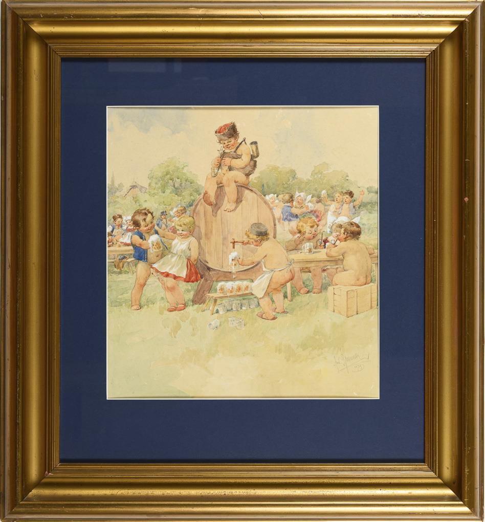 Viele Kinder beim fröhlichen Tanzen, Feiern, Pfeife rauchen und Trinken | Nachtrag 11.10.2023: Der Künstler ist Antonin Brunner (1881 - 1958).