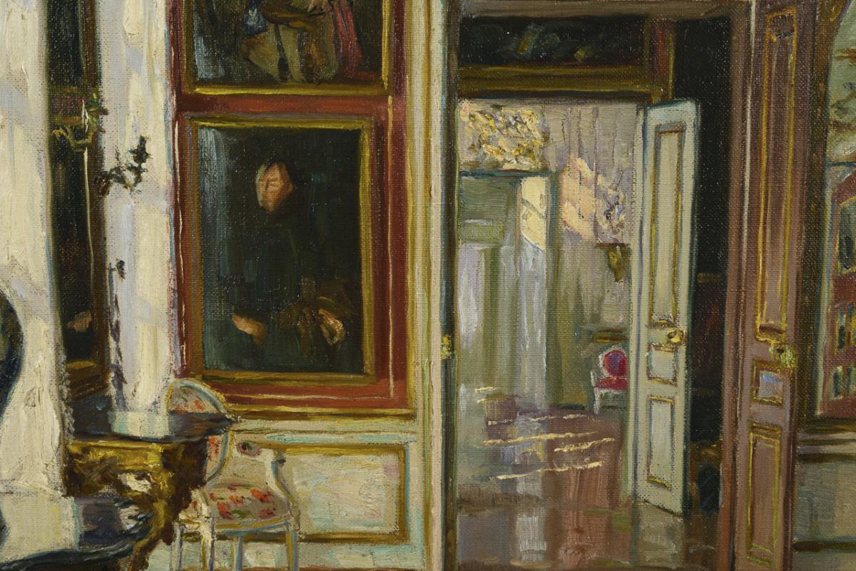 Herrschaftliches Interieur mit zahlreichen Gemälden zwischen Rokokodekor an den hohen Wänden.