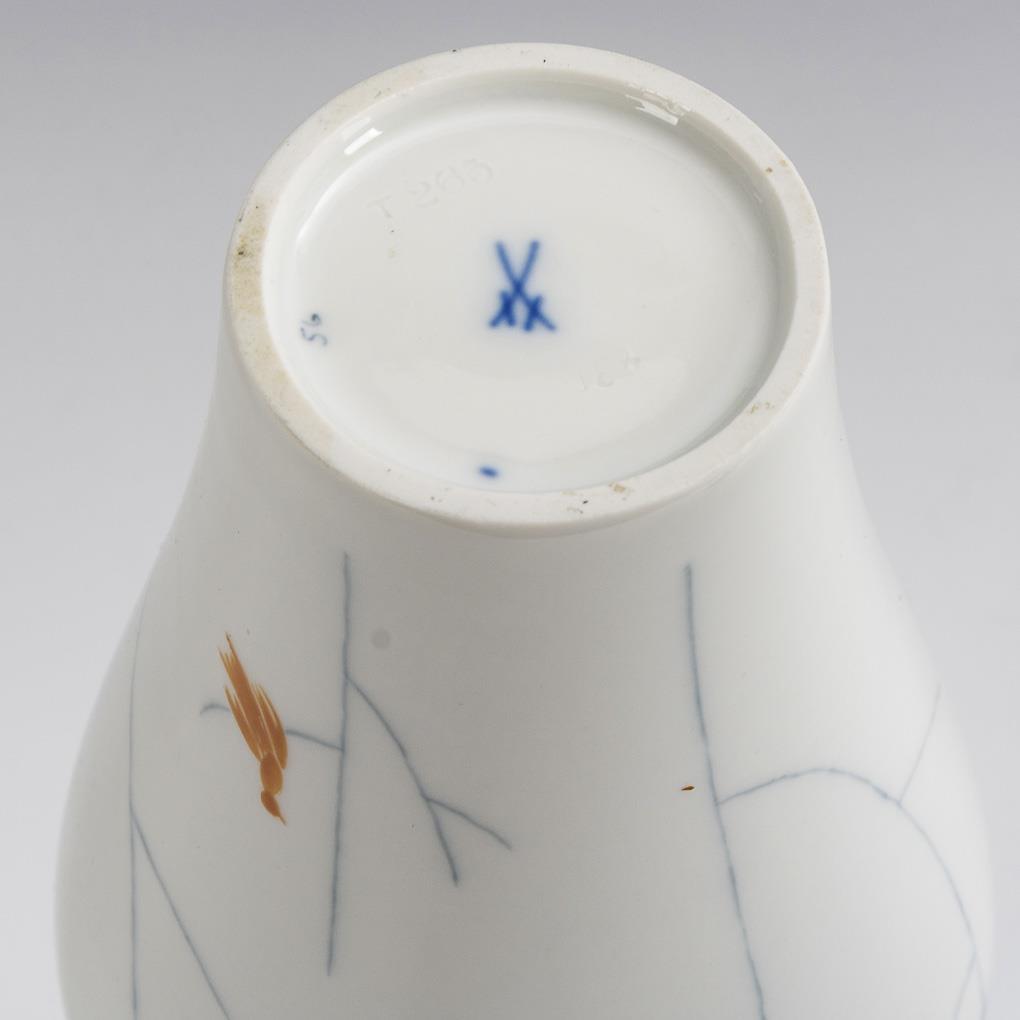 Aus den gemeinsamen Arbeiten der jungen Künstler sticht diese Vase besonders hervor. Den flaschenähnlich geschwungenen Vasenkörper von Ludwig Zepner verzierte Heinz Werner dezent mit "Farbigen Vögeln im Geäst". Zarte rote, grüne und schwarze Vogelsilhouetten turnen in hauchdünnem Gezweig. Es handelt sich um einen sehr frühen Entwurf des siebenundzwanzigjährigen Formgestalters Ludwig Zepner, der später (neben Heinz Werner) zum führenden Kopf der künstlerischen Abteilung der Meissener Manufaktur avancierte.