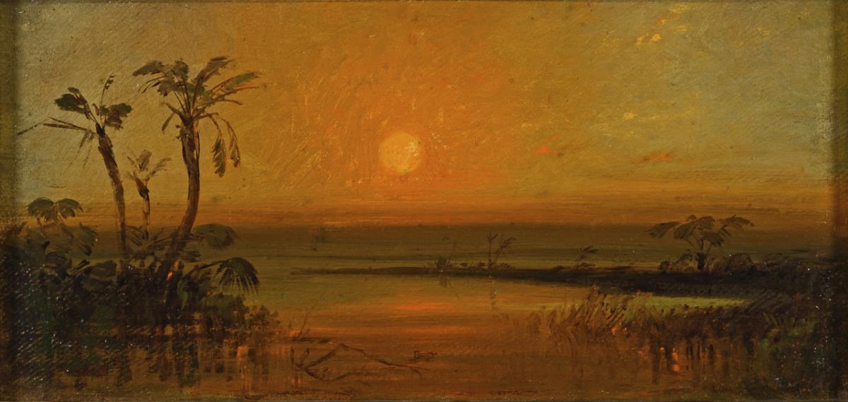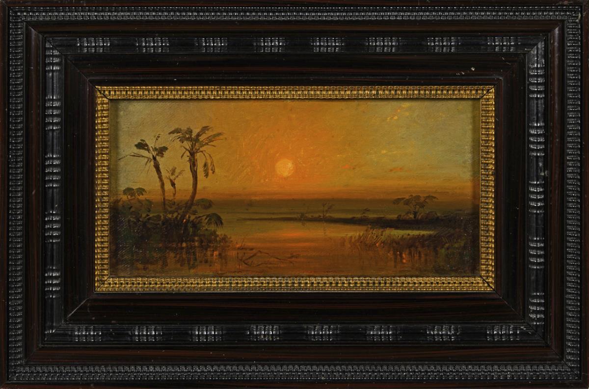 Blick übers Wasser mit den Palmen am Ufer zur orange leuchtenden Sonne über dem Horizont.