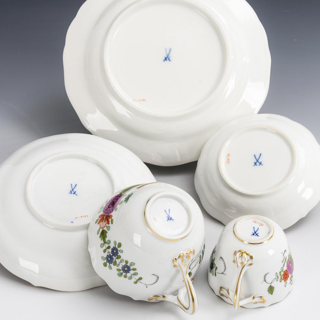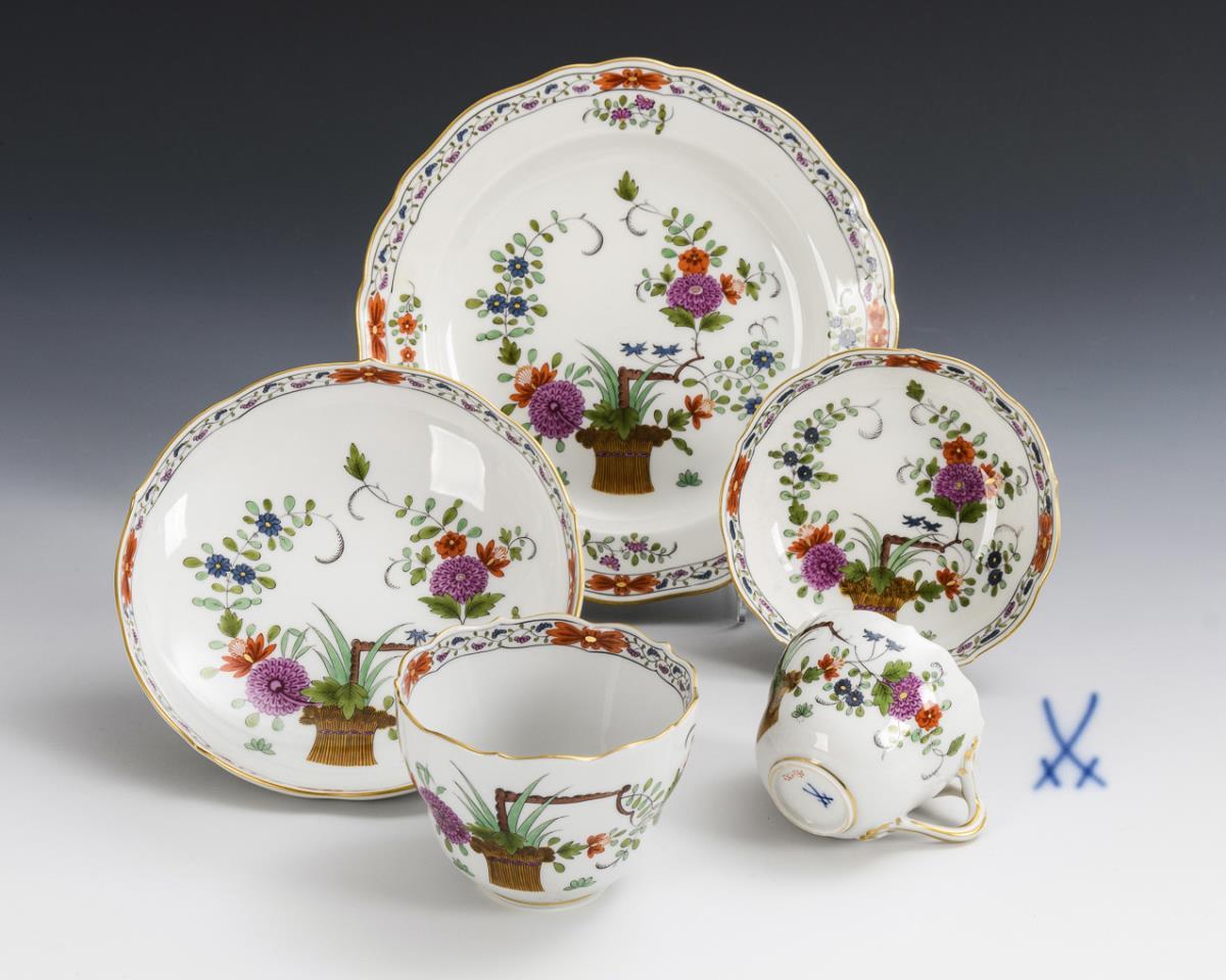 Form "Neuer Ausschnitt". Kaffeetasse (H 6,5 cm), Untertasse (Ø 14,5 cm), Kuchenteller (Ø 18,5 cm), Mokkatasse (H 5,5 cm) und Untertasse (Ø 11 cm)
