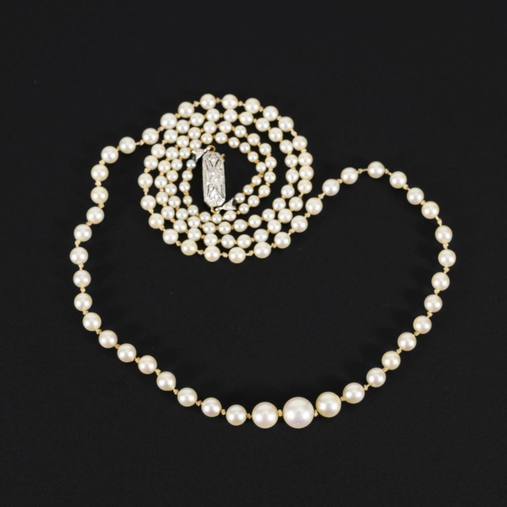 Gelbgold/Weißgoldschließe 585 gestempelt. L 61 cm. Perlen Ø 2-7 mm. 9,1 g.