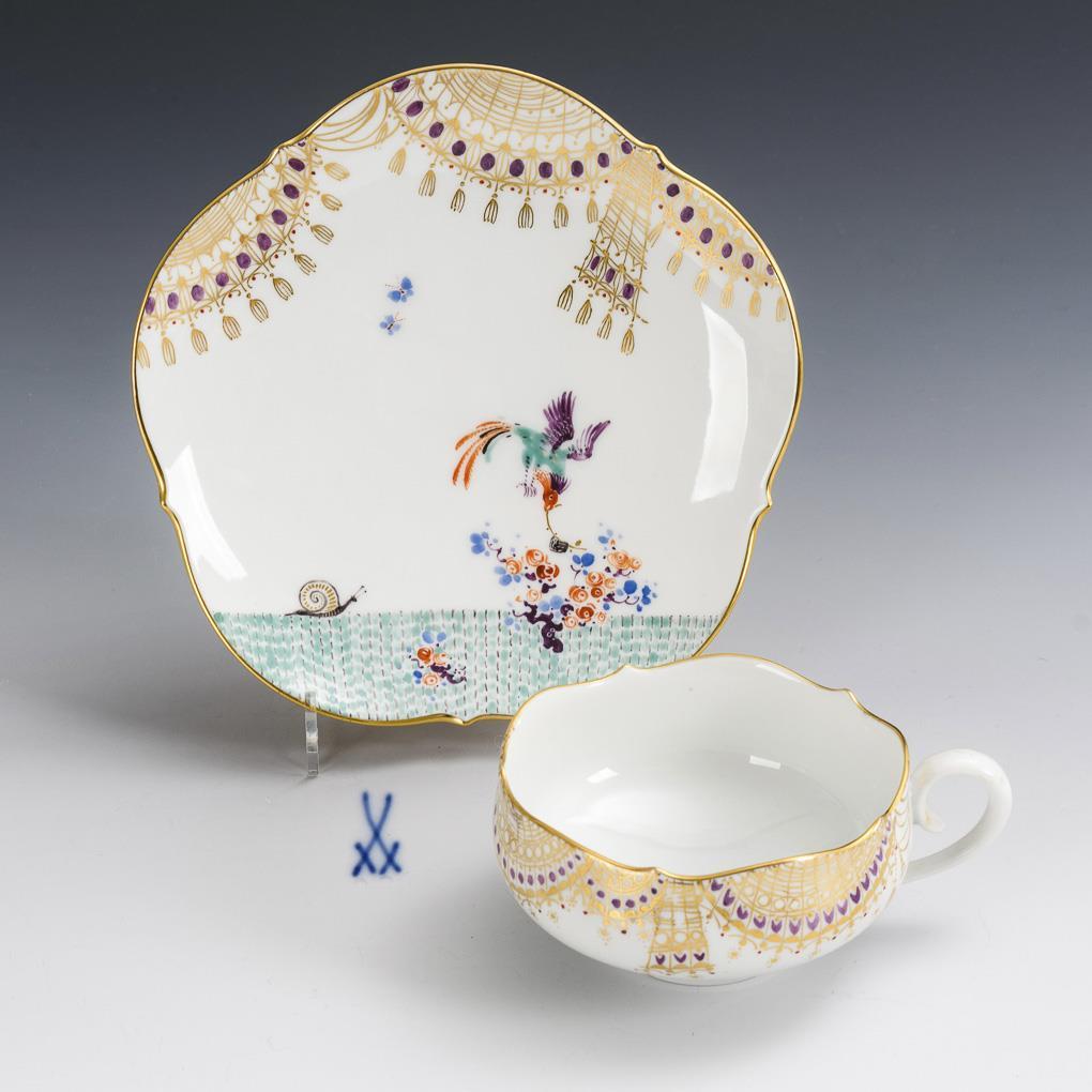 Polychrom bemalt, goldstaffiert. Teetasse (H 5 cm), Untertasse (Ø 15 cm).