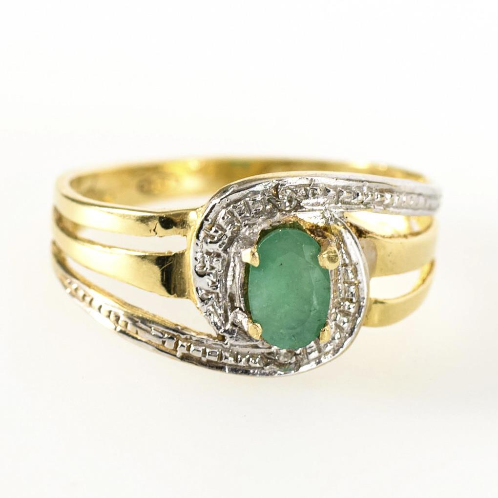Krappengefasster Smaragd zwischen 3-stegiger Schulter und schmaler Schiene.