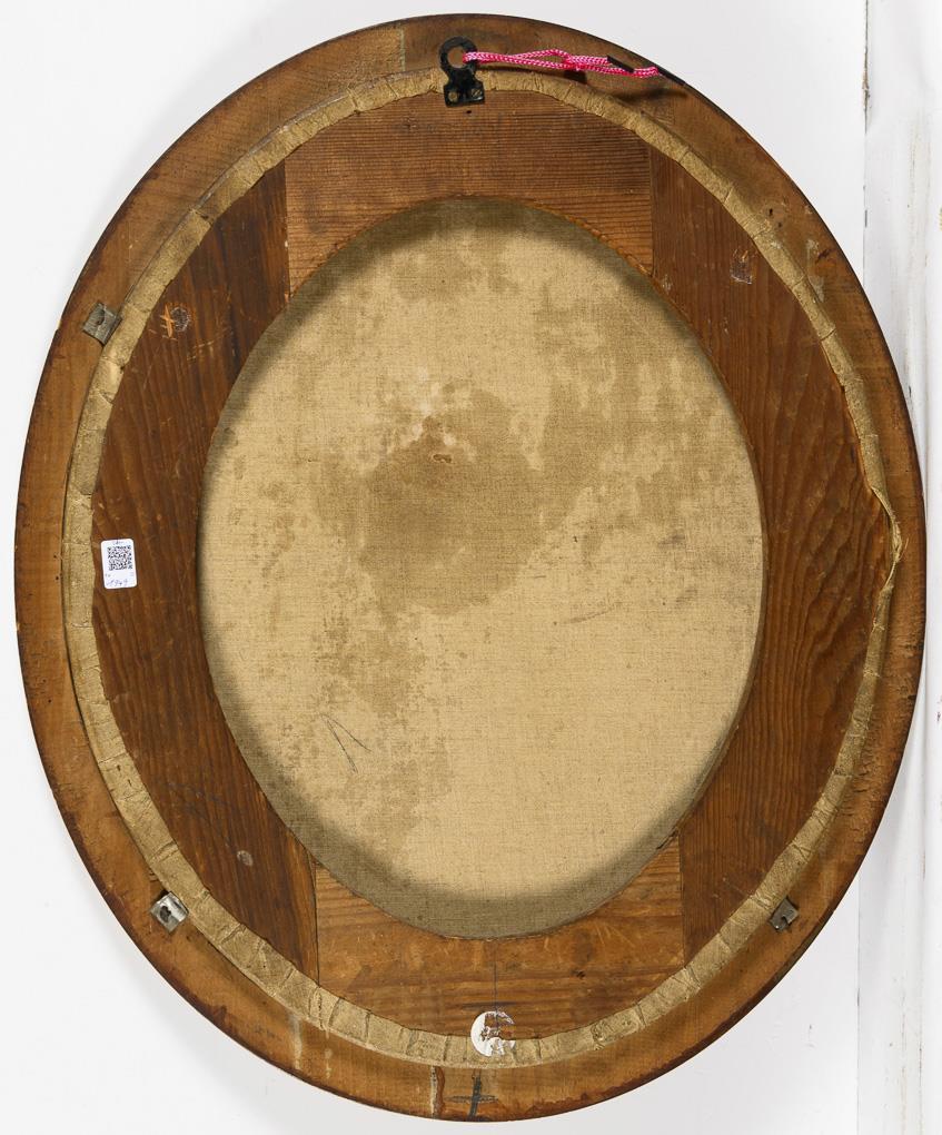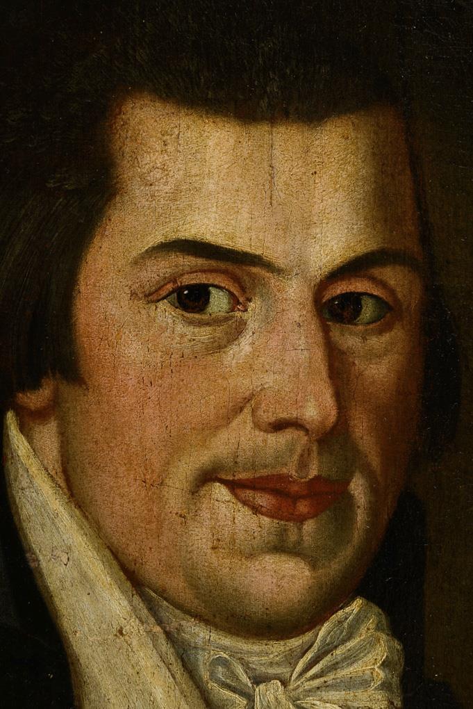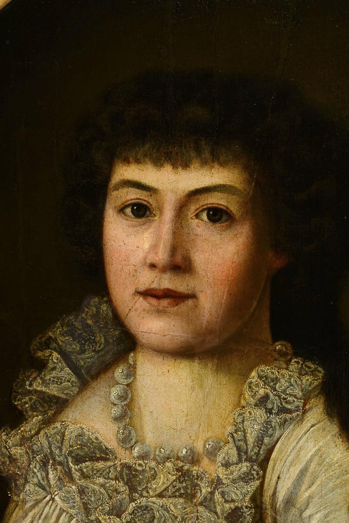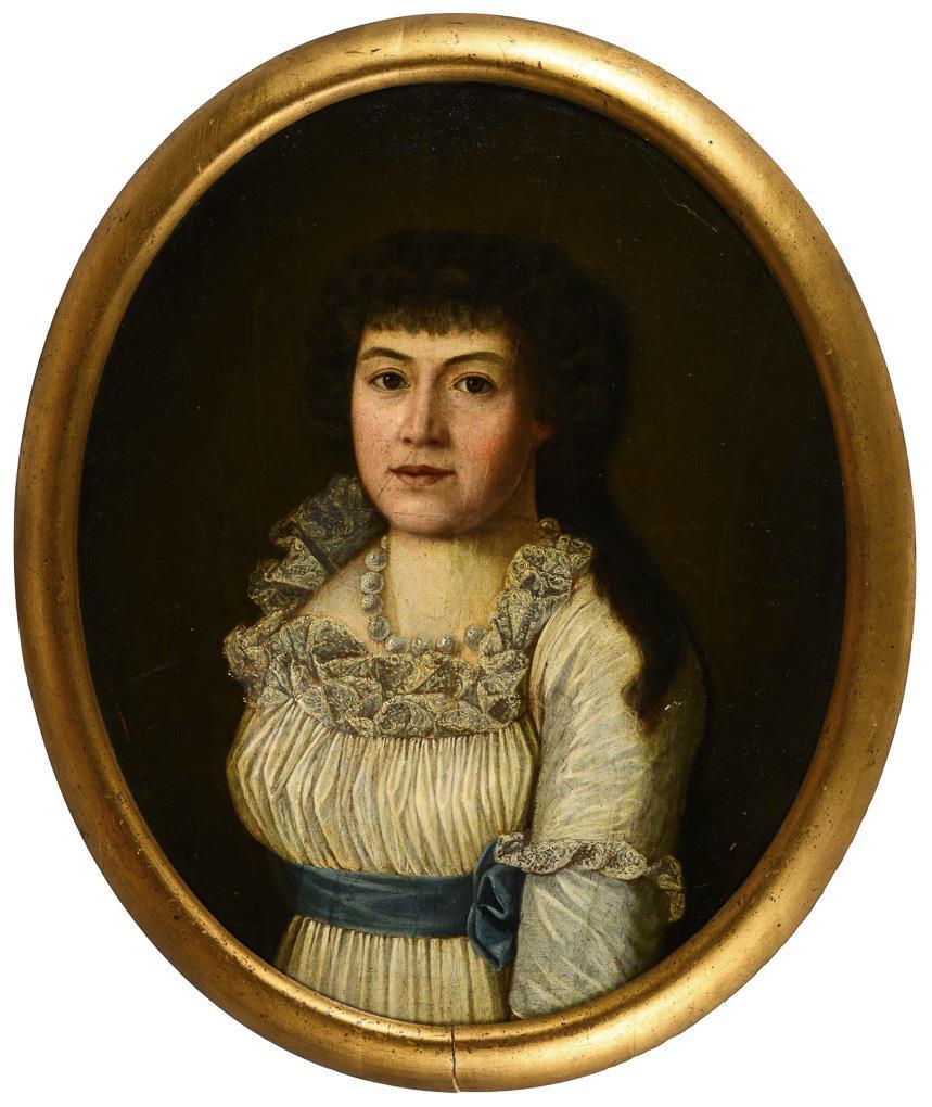 Porträt einer jungen Frau im weißen Kleid mit großer Perlenkette und blauer Schleife sowie eines Mannes im dunklen Gehrock mit weißem Hemd und Weste. Leinwände doubliert.