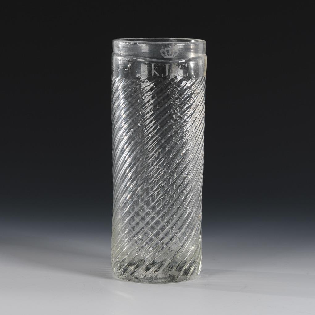 Zylinderglas aus farblosem, schrägoptisch geblasenem Glas mit dem bekrönten Monogramm "K. L. C."; mit Abriss.